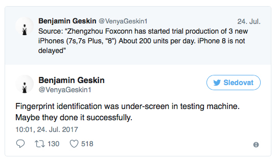 Známý leaker potvrdil, že iPhone 8 nabídne čtečku otisků v displeji