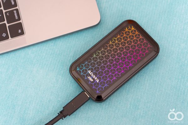 Design je v případě externího disku vždy až druhořadou vlastností, ovšem v případě modelu SE770G si rozhodně zaslouží samostatnou kapitolu. Na první pohled jde o typické „ssdéčko“, ovšem to se rázem změní v momentě, kdy jej připojíte k počítači. Pod lesklým krytem se totiž nachází RGB podsvícení, které v reálu nepůsobí vůbec špatně. Efekt prolínání barev doplňuje mozaikový vzor, což dohromady vytváří zajímavou světelnou show.