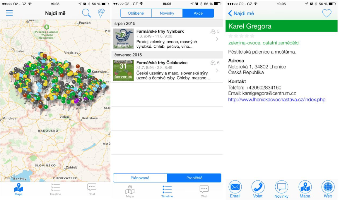 Jak jsme o pár řádků výše nastínili, aplikace se snaží uživateli naservírovat maximum informací o každém farmáři. Pokud se například chcete ujistit o nabídce, na informační kartě stačí stisknout tlačítko volat a rázem se zahájí hlasový hovor na kontaktní osobu. Příjemným bonusem se systém hodnocení výrobce. Jestliže si v databázi vyhlídnete svého oblíbeného dodavatele, lze ho přidat do seznamu oblíbených, odkud k němu budete mít ještě rychlejší přístup. Karta s označením „Timeline”, shromažďuje veškeré novinky a informace o plánovaných či proběhlých akcích.
