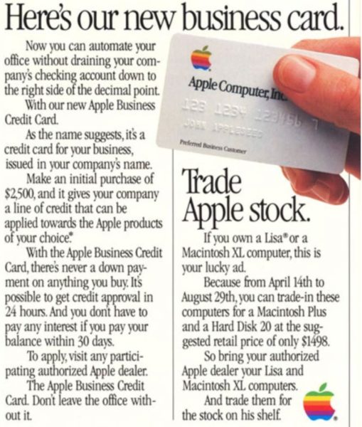 Pamětníci si však vzpomněli na to, že Apple si nechal v časopise o počítačích otisknout inzeráty, které klientům z řad firem i soukromníků slibovaly kredit až 2 500 dolarů. O kartu bylo možné požádat u autorizovaných prodejců Applu. Držitelé karty mohli následně za výhodnějších podmínek nakupoval počítače, což ostatně umožňuje i dnešní Apple Card se svou 3procentní slevou na produkty Applu.