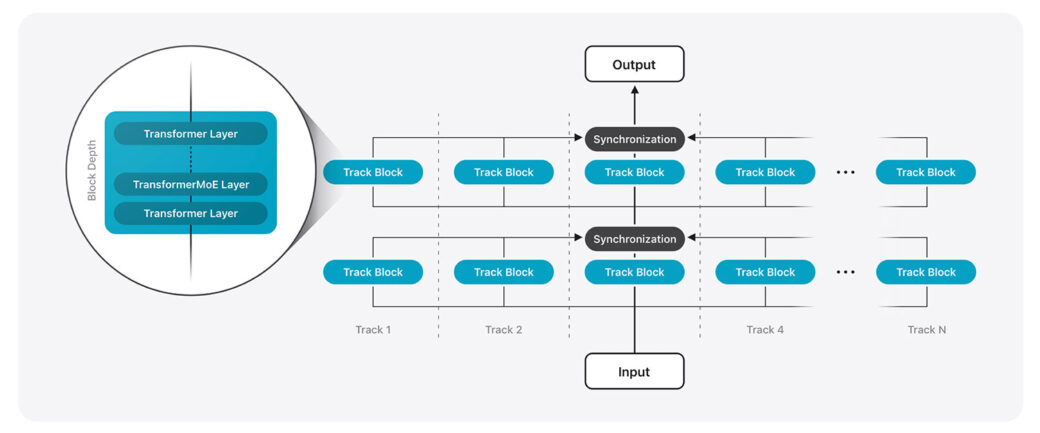 Model je navržen jako Parallel Track Transformer – každý „track“ zpracovává vstupy paralelně a synchronizuje se pouze na určitých místech. Kromě běžných vrstev obsahuje i MoE vrstvy, které aktivují pouze malé množství expertů dle potřeby.