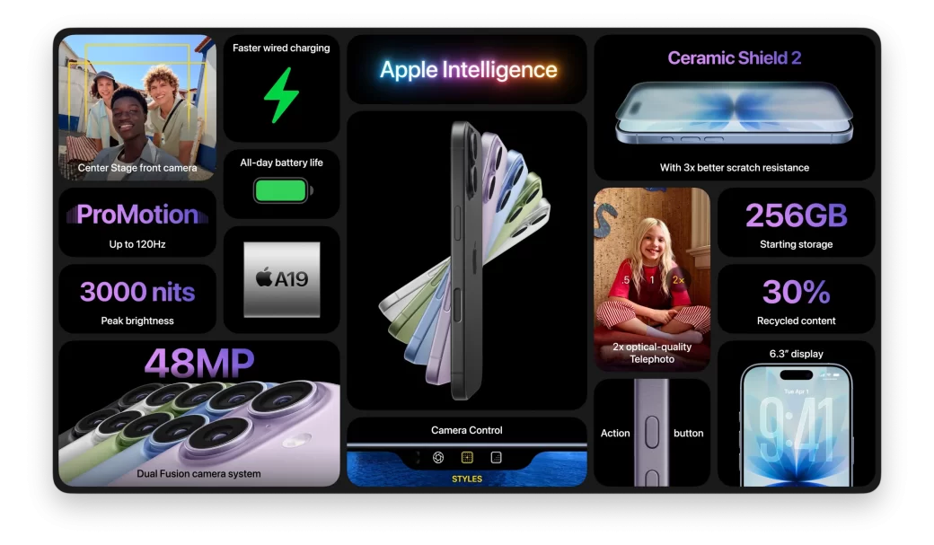 Základ letošní nabídky tvoří iPhone 17, který bude dostupný v pěti barevných variantách – černá, bílá, zelená, modrá a růžová. Za zásadní vylepšení lze označit displej, který se může nově pochlubit technologií ProMotion. Ta umožňuje dynamicky měnit obnovovací frekvenci (až 120 hz) v závislosti na tom, co zrovna se smartphonem děláte. Displej má úhlopříčku 6,3 palce se špičkovým jasem až 3000 nitů.