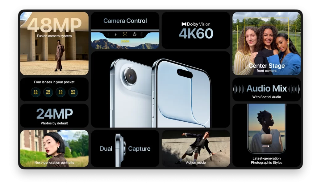 Na zádech najdeme dvojici fotoaparátů v čele s 48Mpx Fusion čipem, který doplňuje širokoúhlá kamera. Za zmínku stojí tak čelní FaceTime kamerka, která má větší plochu snímače a čtvercový formát, což umožňuje lepší možnosti s aktivním Center Stage.