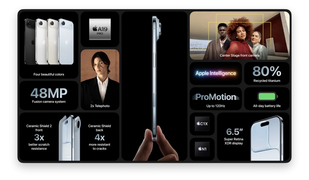 Výpočetní jednotkou se stal čip A19, který zahrnuje šestijádrové CPU a pětijádrovou grafiku. Pro potřeby Apple Intelligence je k dispozici 16jádrový Neural Engine. Poslední zajímavostí, o které by měli zájemci vědět, je implementace Ceramic Shield vrstvy, která se zde objevuje v nové iteraci, jež iPhonu propůjčuje 3x vyšší odolnost vůči mechanickému poškození displeje.
