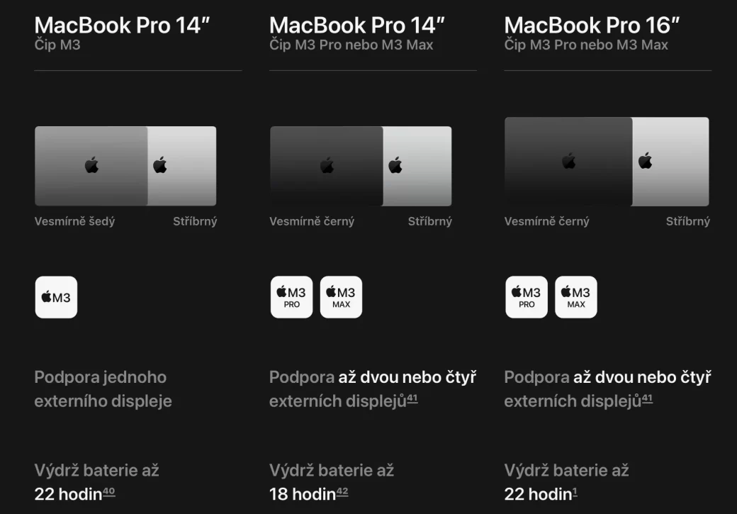MacBook Pro s čipem M3 startuje na částce 49 990 korun. Za výkonnější M3 Pro zaplatíte 59 990 Kč, respektive 71 990 Kč v případě lépe vybavené verze s 1TB SSD a 12jádrovým procesorem. Nejvýkonější M3 Max začíná na ceně 95 990 Kč, za což dostanete 36 GB jednotné paměti a 1TB úložiště. Co se týče dostupnosti, Apple uvádí dodání od 7. listopadu. U výkonnější variant se doba dodání pohybuje v horizontu dvou až třech týdnů.