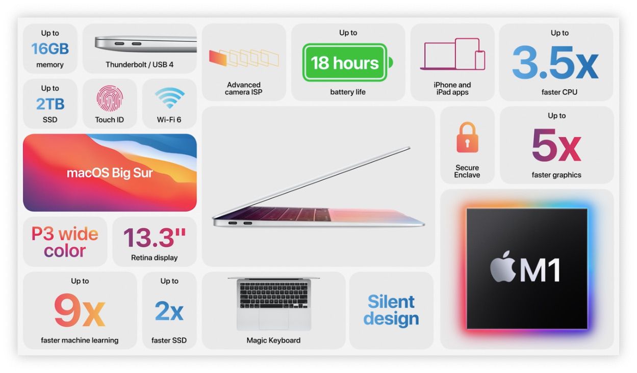 Apple se nezapomněl pochlubit 5nm výrobním procesem, díky čemuž se do čipsetu vešlo 16 miliard tranzistorů. Nový MacBook Air je díky němu 3,5x rychlejší než předešlá verze, kterou poháněly procesory od Intelu.