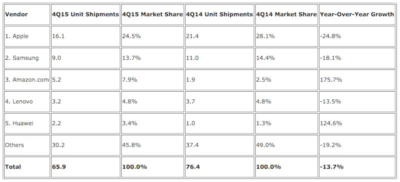 Poslední čísla zveřejněná společností IDC se zaměřila na strmě se propadající trh tabletů, kterému stále ještě vládne Apple. Jeho pokles o 24 procent je však ze všech sledovaných společností nejrazantnější. Applu tak v propadu prodejů rodiny iPadů nemohlo ani představení obřího iPad Pro. Prodeje tabletů za poslední kvartál loňského roku tak potěšily jen čínský Huawei a americký Amazon, kteří dokázali prodejnost svých produktů zvýšit o více než 100 procent. I přesto však celý segment tabletů v posledním čtvrtletí minulého roku zaznamenal propad o 13,7 procent, i tak se ale celosvětově prodalo více než 65 milionů tabletů.