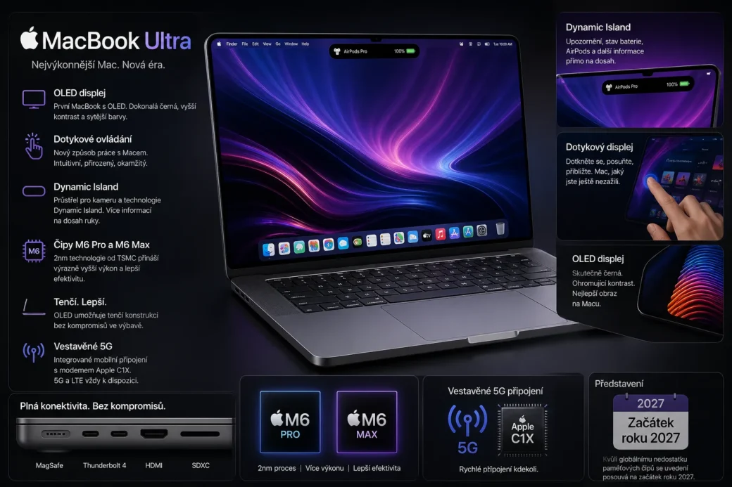 Apple naposledy výrazně přepracoval MacBook Pro v roce 2021 s příchodem čipů M1 Pro a M1 Max. Pokud se současné spekulace potvrdí, MacBook Ultra by znamenal první zásadní redesign po více než pěti letech – a právě na takový model řada zákazníků čeká. Je ale důležité dodat, že základní 14″ MacBook Pro s čipem M6 pravděpodobně většinu těchto změn nedostane. Novinky mají být vyhrazeny především pro vyšší modely.