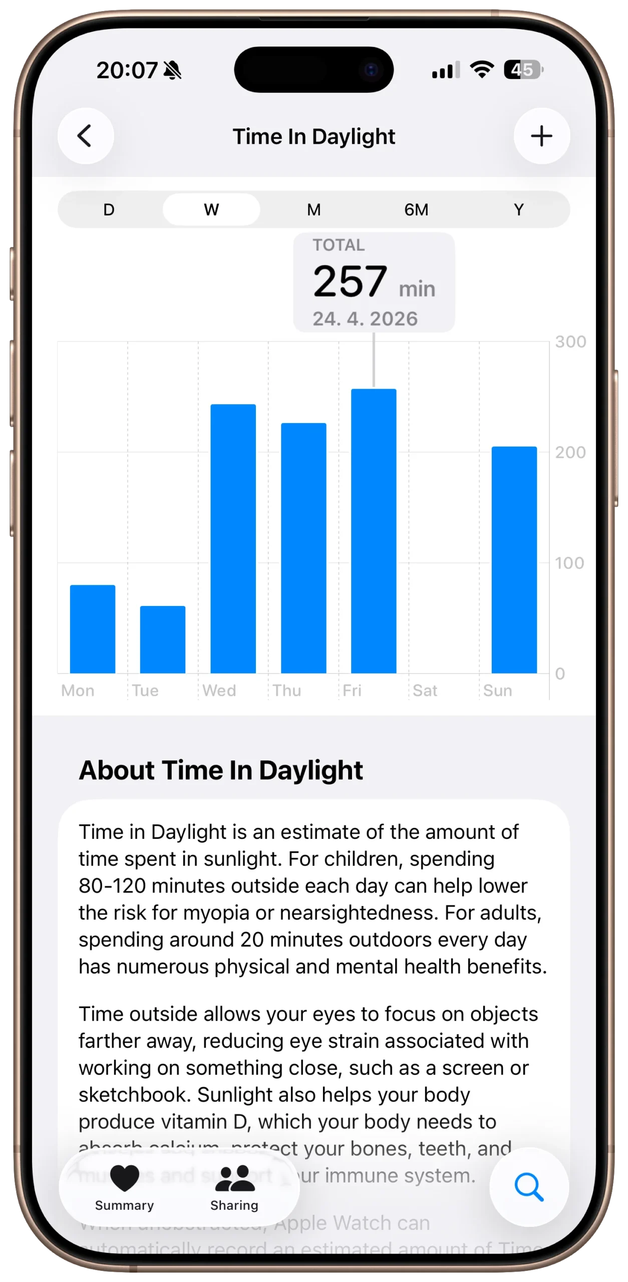 „Čas na denním světle je odhad množství času stráveného na slunečním světle. Pokud nejsou hodinky zakryté, Apple Watch dokážou automaticky zaznamenávat odhadovaný čas strávený venku.“