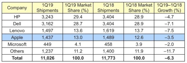 Výrobci počítačů dodali v prvním čtvrtletí letošního roku svým zákazníkům méně produktů než ve stejném období loňského roku. Stejně tak se mírně propadly také prodeje řady Mac od Applu. Podle dat zveřejněných agenturou Gartner, je však pokles prodejů v případě Applu nižší než u zbytku trhu. Výrobce MacBooků a iMaců v prvním kvartále letošního roku prodal necelé 4 miliony počítačů, což jej řadí na čtvrté místo.