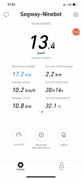 První kilometry je Ninebot přepnutý do začátečnického režimu. To znamená, že maximální rychlost je omezena na cca 10 km/h. Pokud se pokusíte o zrychlení, dostanete zvukové upozornění a vozítko začne okamžitě zpomalovat. Po rozježdění se rychlostní limit začne pomalu navyšovat a vy můžete naplno vyzkoušet schopnosti vozítka.