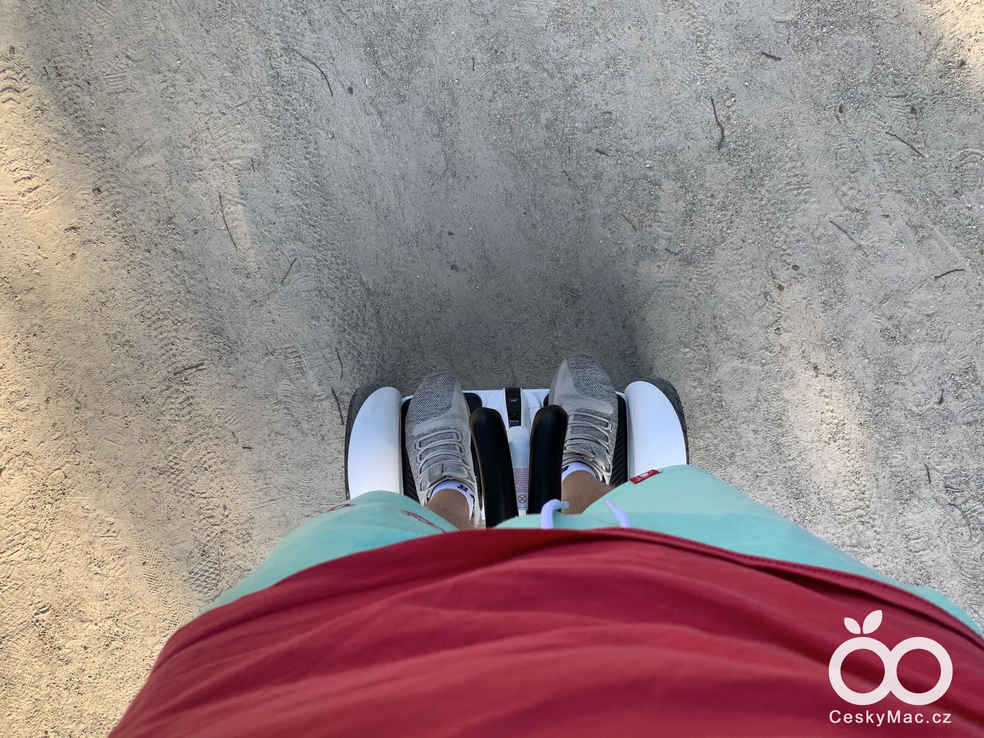 Po zapnutí se Ninebot stabilizuje a vy můžete okamžitě nastoupit. Zpočátku jsem byl poněkud rozpačitý a bál se, že místo ladného rozjezdu bude následovat konfrontace mých zad s asfaltem. Tyto obavy se naštěstí ukázaly jako liché. Prvních pět minut jsem se sice klepal jako osika a neujel více než několik metrů, ale pak přišel zásadní zlom. Zhruba po čtvrthodině jsem si byl jízdou na Ninebotu naprosto jistý.