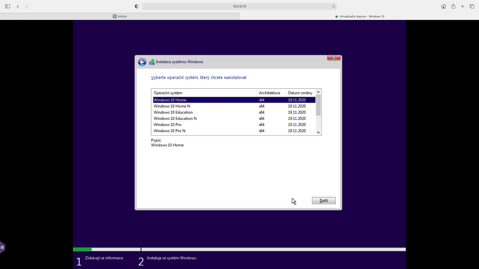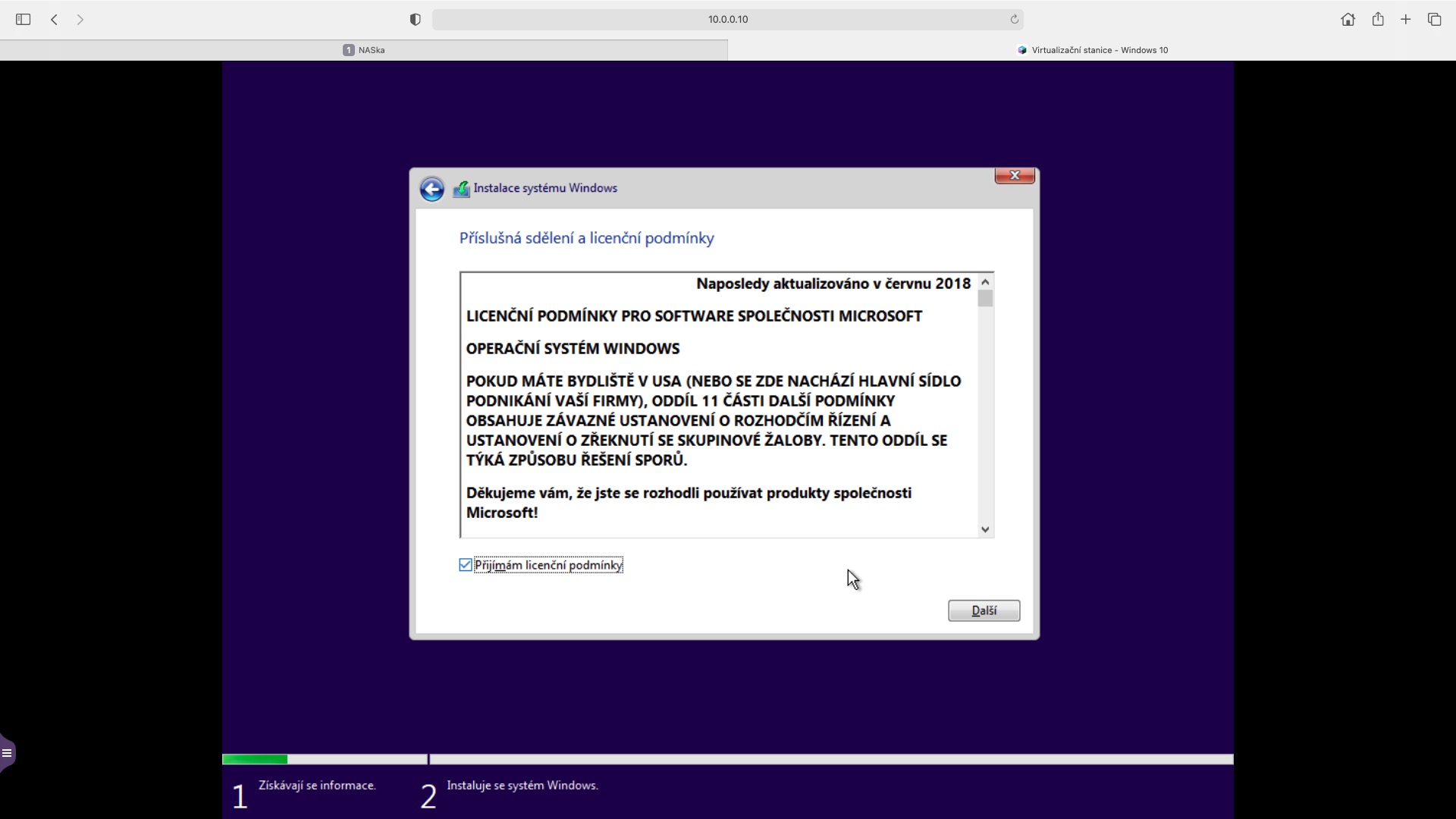 Po otevření virtuálního počítače vybereme jazyk a klikneme na Další. Nyní jsme žádání zadat Product Key, pokud ho ale nemáme, stačí kliknout Nemám kód Product Key a vybrat verzi, kterou chceme instalovat. Přijmeme licenční podmínky a klikneme na Vlastní: Jenom nainstalovat Windows. Poté už jen potvrdíme instalační disk a počkáme na nainstalování Windows.
