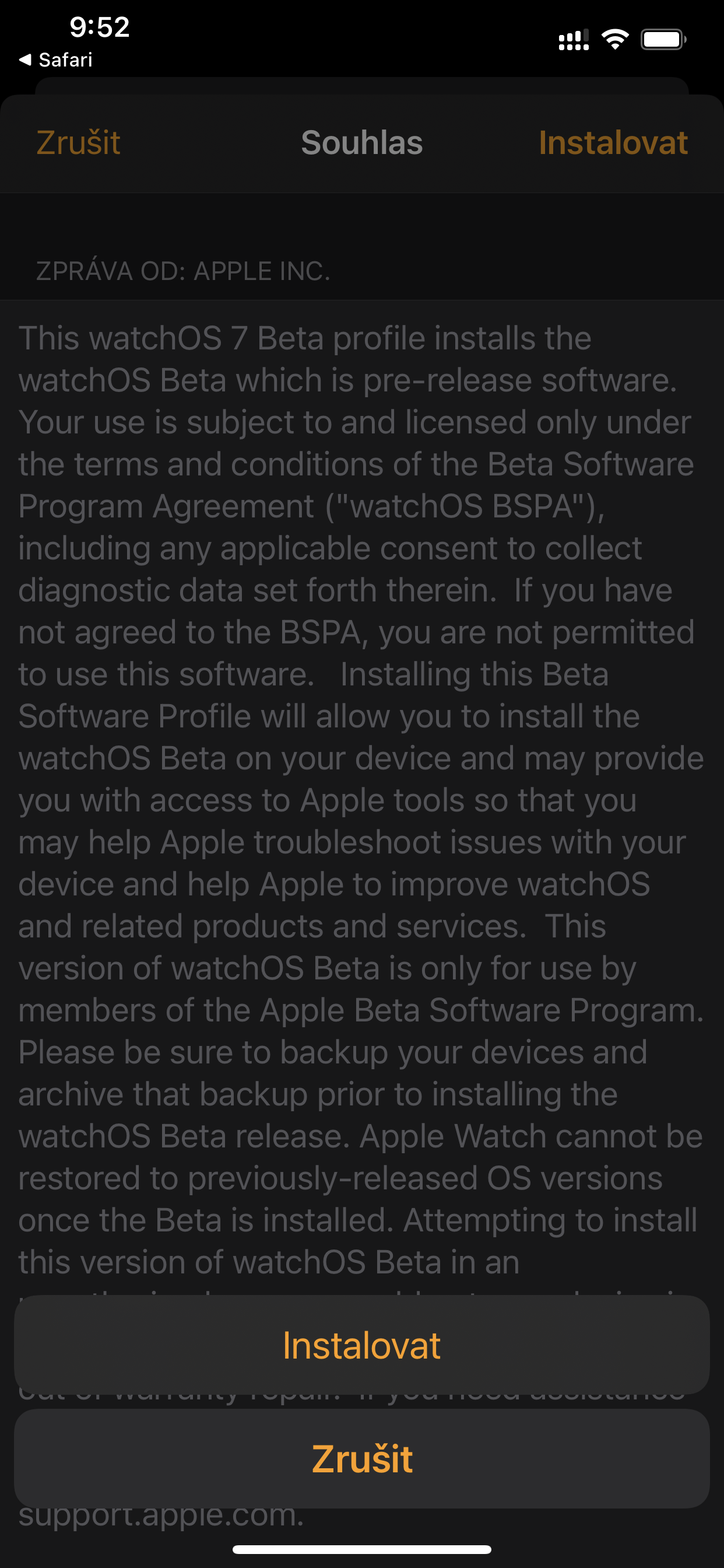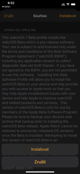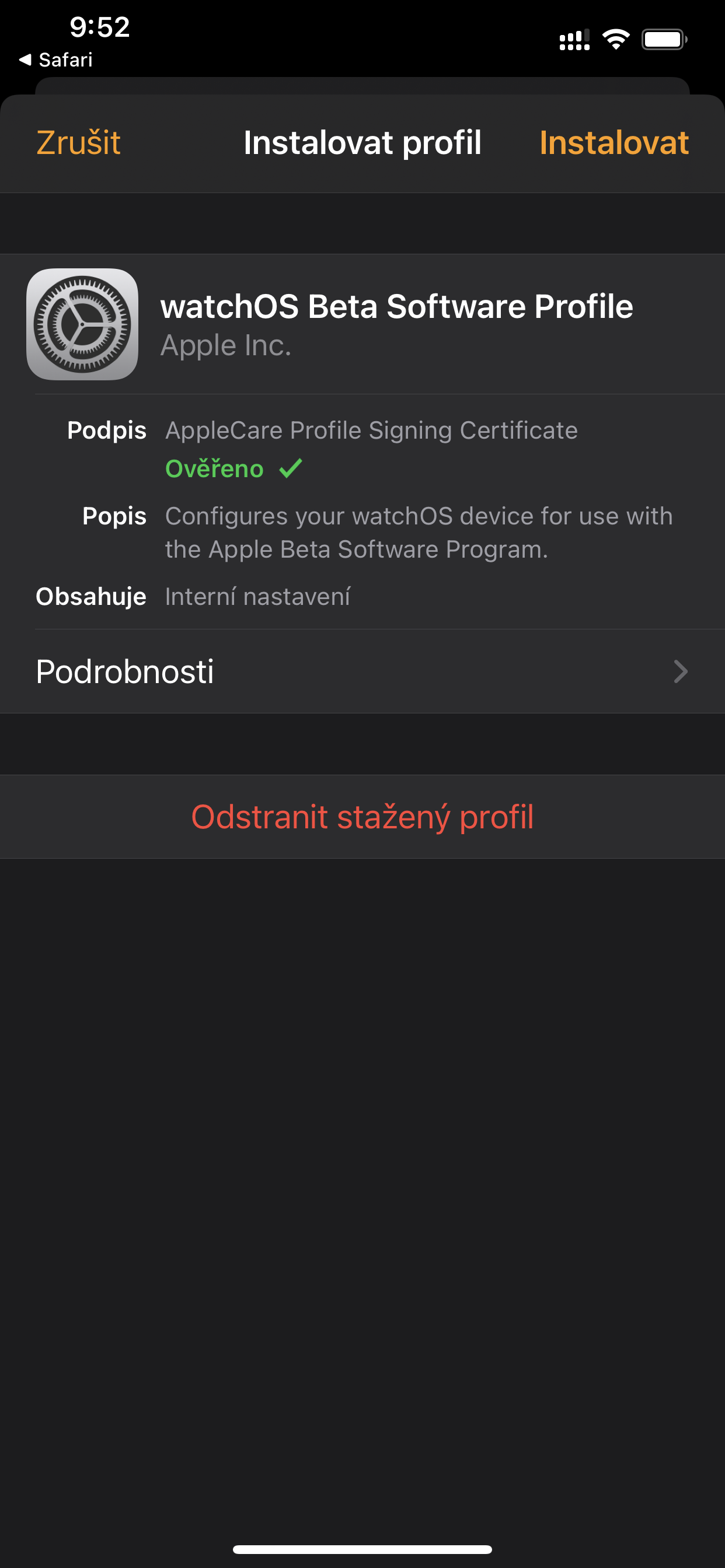 - Budete přesměrováni do aplikace Apple Watch, kde nainstalujete profil. V pravém horním rohu kliknete na Instalovat a zadáte kód svého iPhonu.