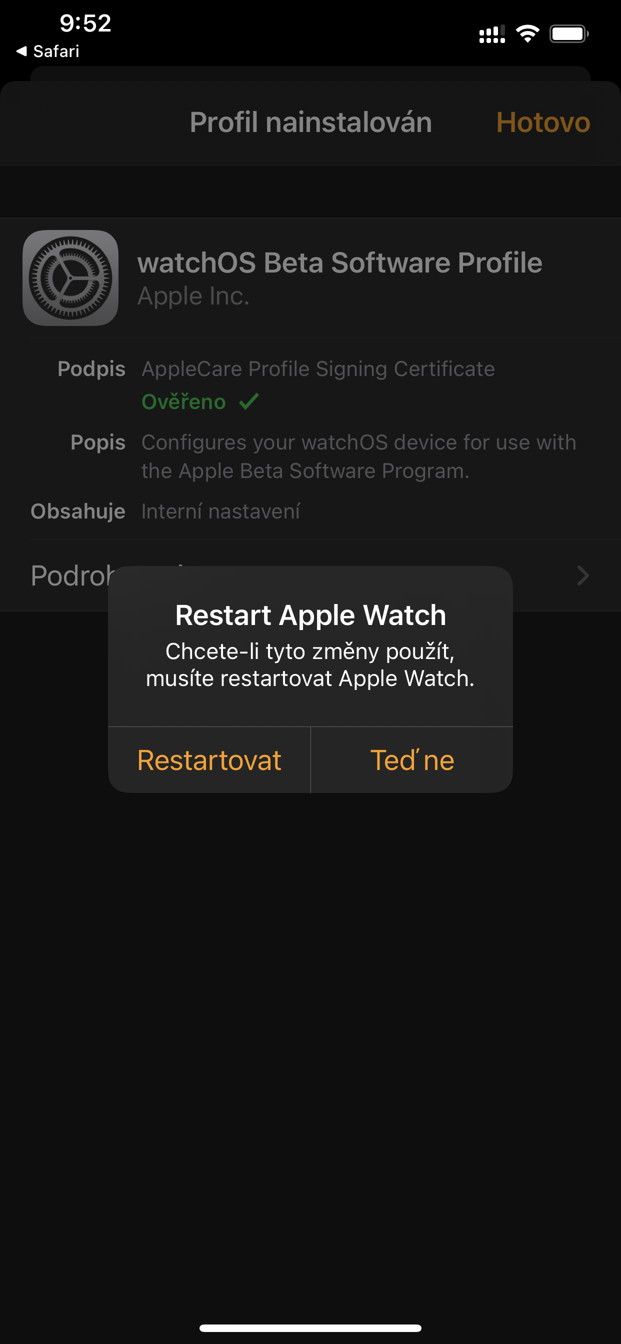 - Aplikace vám navrhne restart Apple Watch, který je potřeba pro nainstalování profilu. Klikněte tedy na tlačítko Restartovat.
