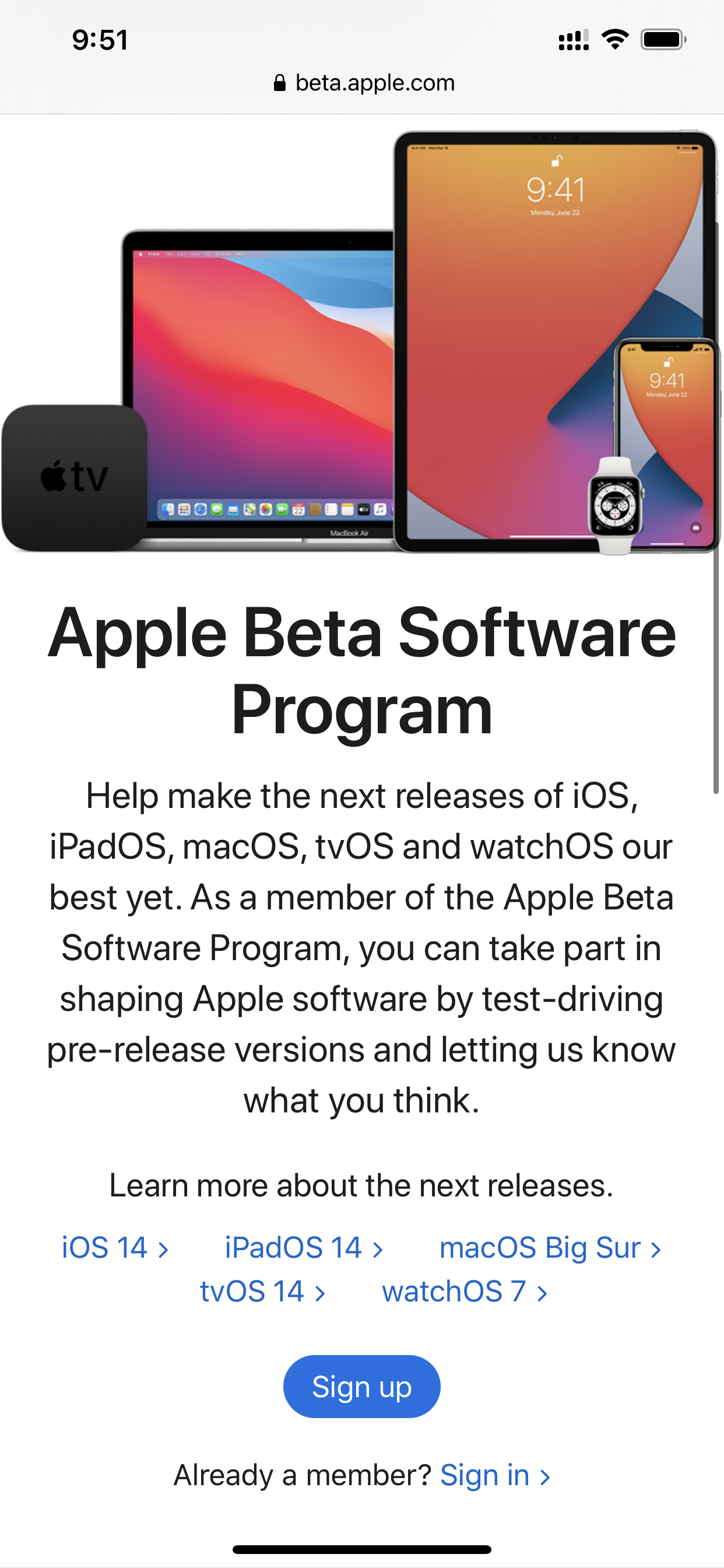 - Klikněte na Sign Up a zaregistrujte se do beta programu. Pokud už jste zaregistrováni, protože například testujete iOS 14, klikněte na Sign In.