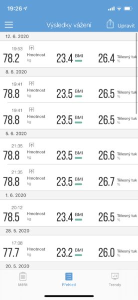 Po otevření máme na výběr ze tří dalších podskupin – Měřit, Přehled a Trendy. Jak už názvy dávají tušit, v záložce Měřit probíhá aktuální měření, což neznamená nic jiného, než to, že se vám při stoupnutí na váhu přenesou aktuální informace přímo na displej telefonu. Záložka Přehled pak ukazuje veškerá vaše vážení, která jste kdy na váze provedli. A konečně poslední záložka – Trendy.