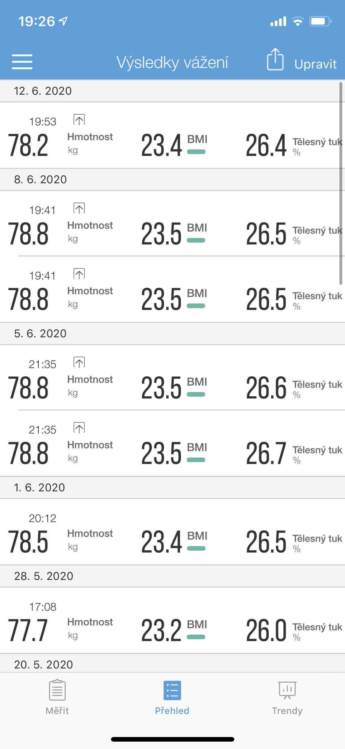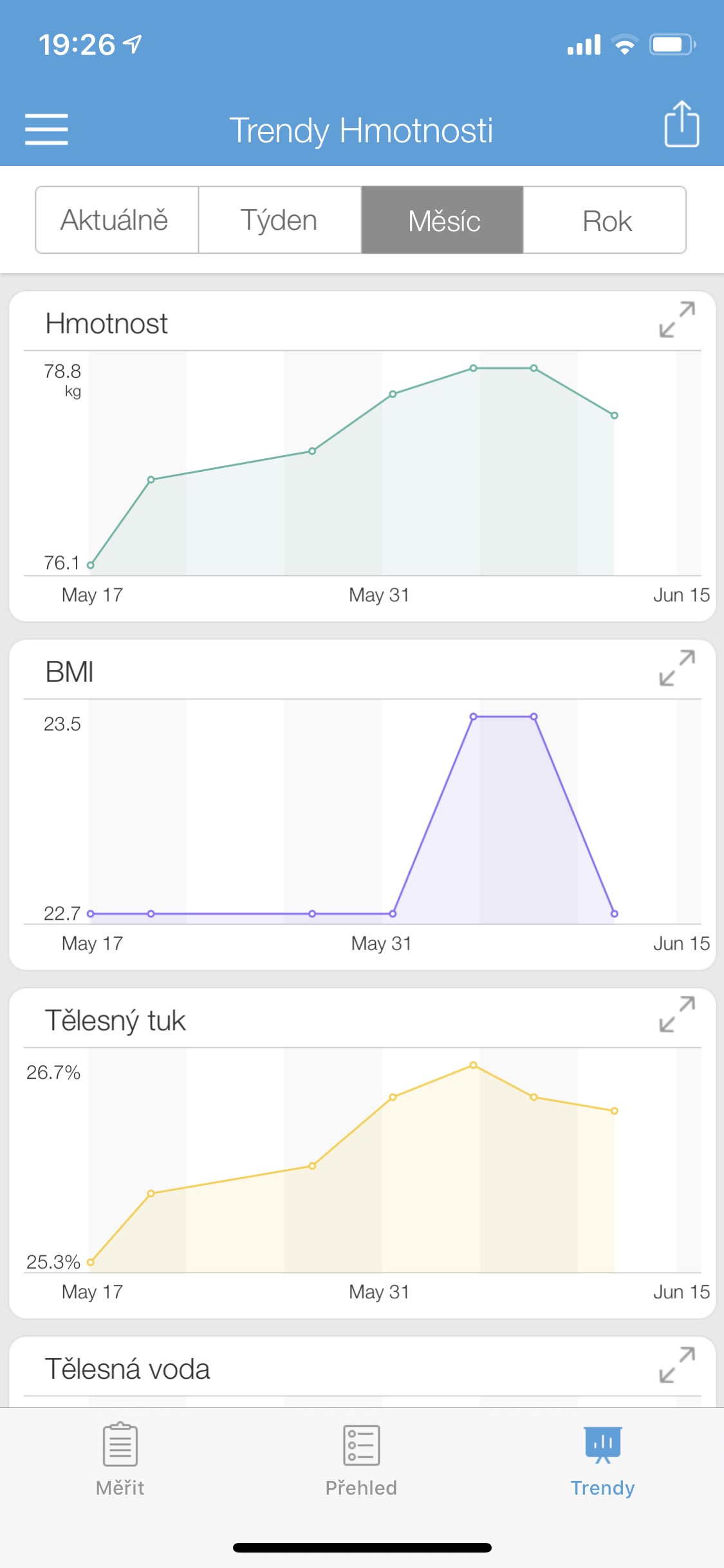 Po otevření máme na výběr ze tří dalších podskupin – Měřit, Přehled a Trendy. Jak už názvy dávají tušit, v záložce Měřit probíhá aktuální měření, což neznamená nic jiného, než to, že se vám při stoupnutí na váhu přenesou aktuální informace přímo na displej telefonu. Záložka Přehled pak ukazuje veškerá vaše vážení, která jste kdy na váze provedli. A konečně poslední záložka – Trendy.