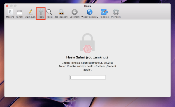 - Vyberte záložku s názvem Hesla a zadejte heslo, kterým se přihlašujete do macOS, majitelé MacBooků Pro s Touch Barem mohou použít otisk prstu