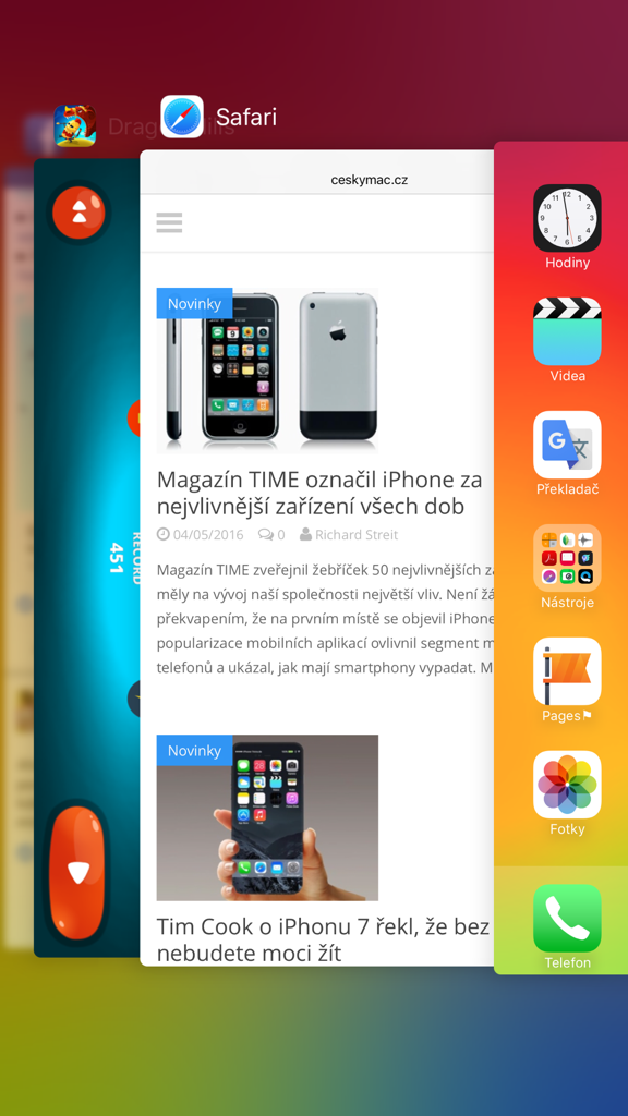 S příchodem iPhonu 6s/Plus se v iOS objevilo nové gesto pro přepínání mezi spuštěnými aplikacemi. Jeho vyvolání provedete silným stlačením levého okraje displeje. Tažením prstu doprostřed plochy se dostanete na náhledy naposledy spuštěných aplikací. Plynulým tažením prstu až k pravému okraji rovnou skočíte do naposledy otevřené aplikace. Ačkoli jde o intuitivní gesto, rozhodně není rychlejší než vyvolání multitaskingu prostřednictvím domovského tlačítka. Největší smysl dává v případě, pokud iPhone ovládáte levou rukou.
