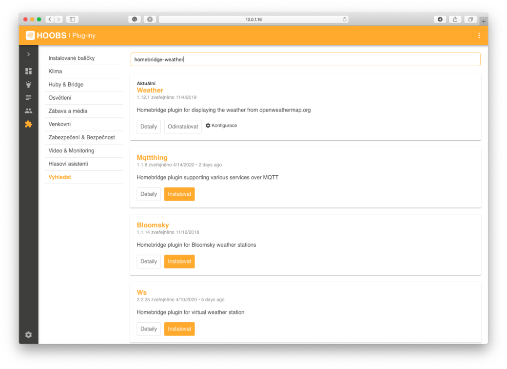 Klikněte na ikonu pluginu a poté na tlačítko vyhledat. Zde zadejte homebridge-weather. Na prvním místě by měl být plugin Weather. Klikněte na tlačítko Instalovat.