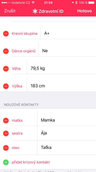 - V poslední řadě je dobré přidat alespoň jeden krizový kontakt. Člověk, který vás zachraňuje se díky tomu může spojit s vaší rodinou a předat jim důležité informace.