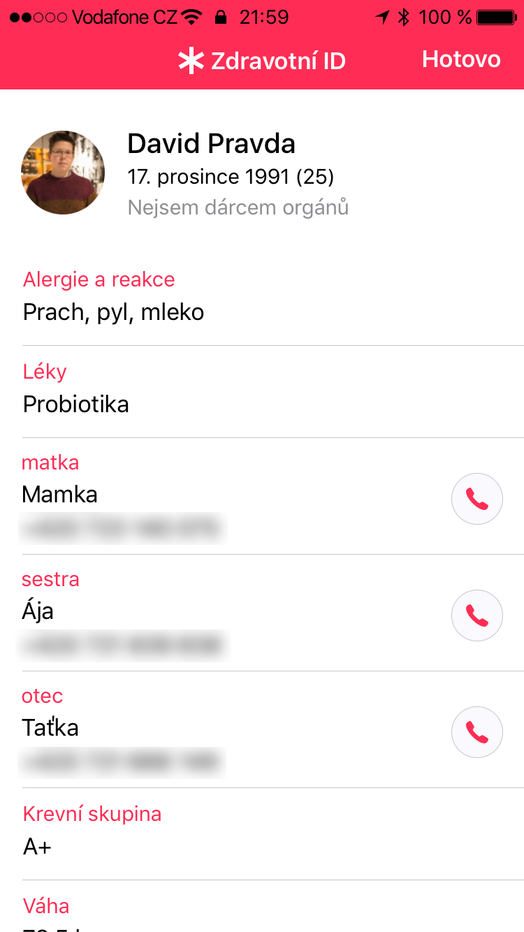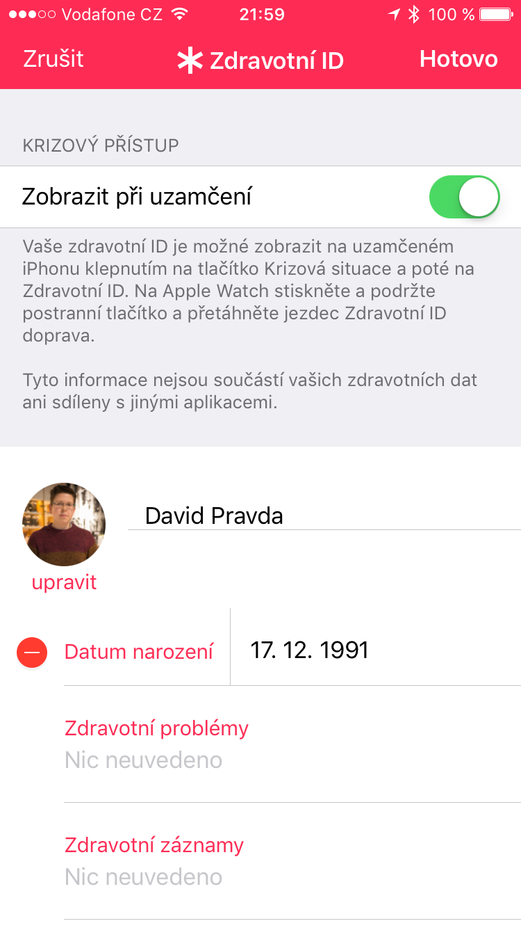 Nezapomeňte, že v rámci co nejefektivnější lékařské pomoci je dobré své zdravotní informace pravidelně aktualizovat. I přesto, že je tato funkce užitečná, doufám, že ji nikdy nebudete potřebovat, ať už jako zachránce nebo pacient.