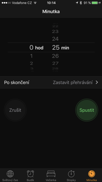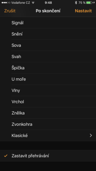 - Klikněte na tlačítko „Po skončení“. Kromě nejrůznějších zvuků, které se přehrají po odpočtu času, je tady možnost Zastavit přehrávání. Tato funkce po vypršení stanovené doby zastaví jakoukoliv činnost na vašem iPhonu.