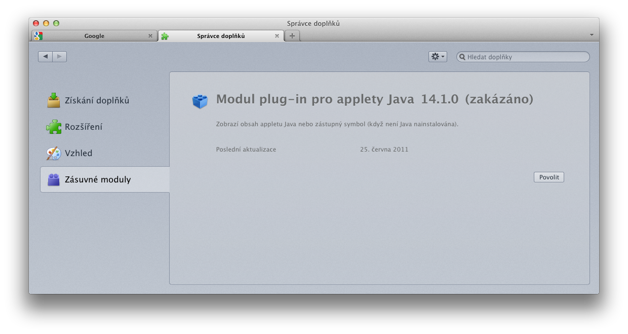 Firefox – V okně prohlížeče klávesovou zkratkou SHIFT + CMD + A spusťte Správce doplňků, kde v záložce Zásuvné moduly zakažte plug-in pro applet Java (viz. obrázek 2)