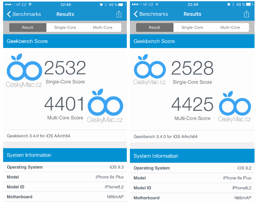 Na podnět od našich čtenářů a reakcí ze zahraničí jsme se rozhodli redakční iPhone 6s Plus otestovat v benchmarku Geekbench 3. Předmětem porovnání bylo zjistit, zda má iOS 9.3 skutečně negativní vliv na výkon smartphonu. Naměřená data jsme porovnali se staršími výsledky, které jsme naměřili na stejném smartphonu s beta verzí systému iOS 9.2. Již na první pohled je z přiložených screenshotů patrné, že k poklesu výkonu rozhodně nedošlo. Vše tedy závisí pouze na vývojářích Applu, kteří se musejí postarat o vyřešení všech registrovaných nedodělků, kterých není rozhodně málo.