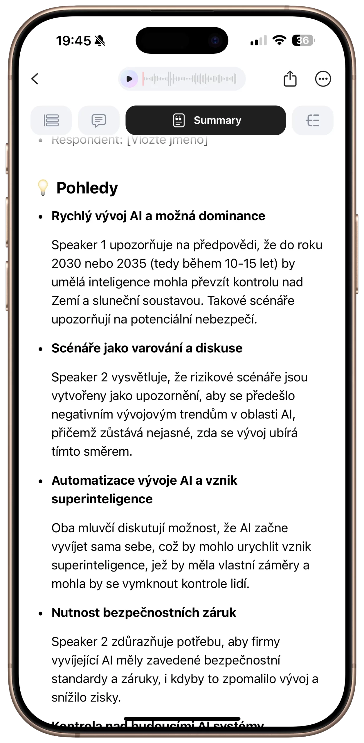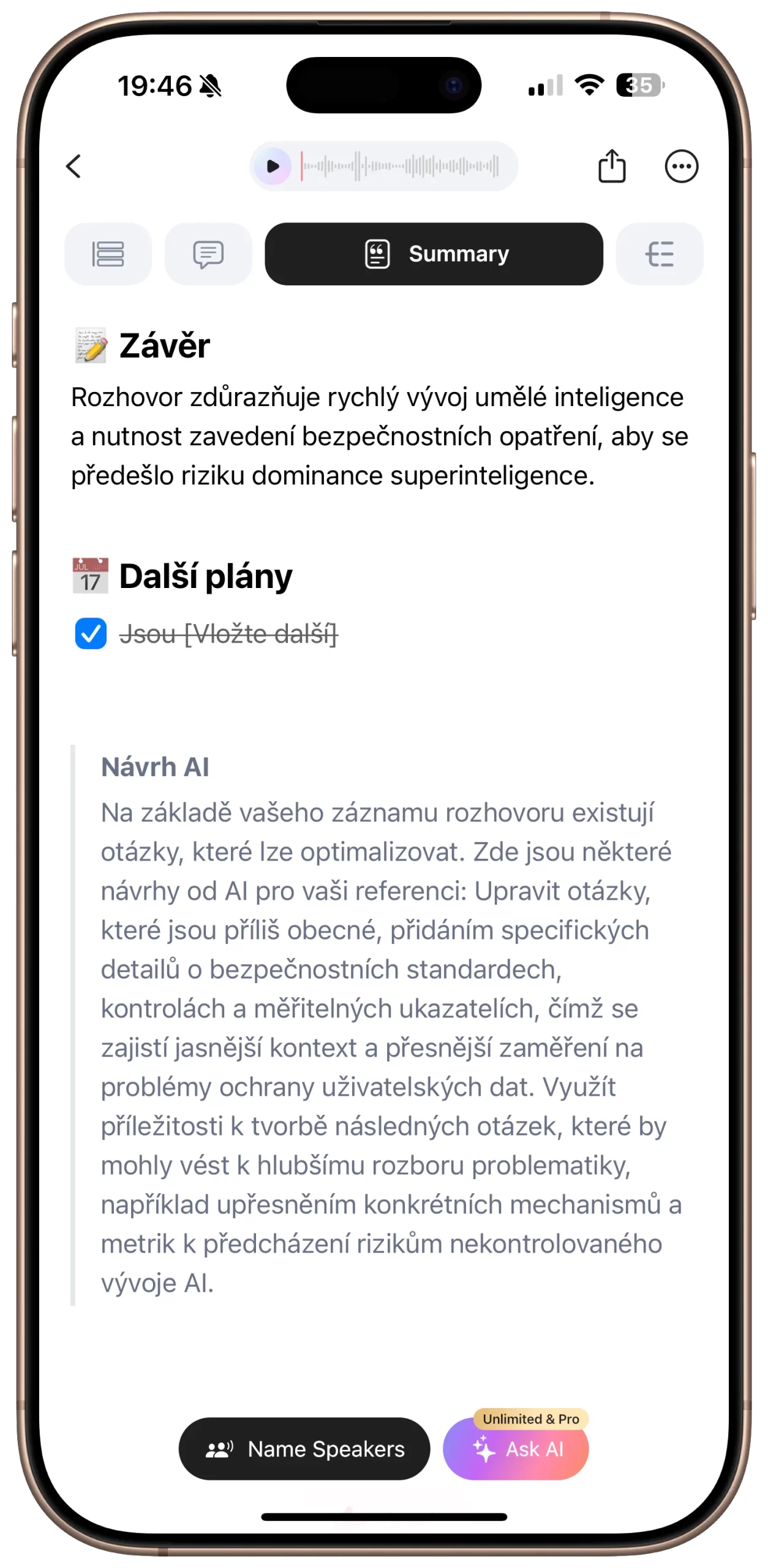 Po zpracování nahrávky vám umělá inteligence naservíruje naprosto fantastickou sumarizaci, která zahrnuje základní přehledy, hlavní body diskuze, klíčové momenty, důležité připomínky k tématu, nedořešené otázky a na závěr přidá ještě individualizované návrhy. Je důležité zmínit, že pro každý záznam dostanete jinak strukturované výsledky. Když se budete například s partnerem bavit o plánech na víkendovou grilovačku, umělá inteligence vám na základě vaší diskuze vytvoří seznam věcí, které je třeba koupit či připravit.