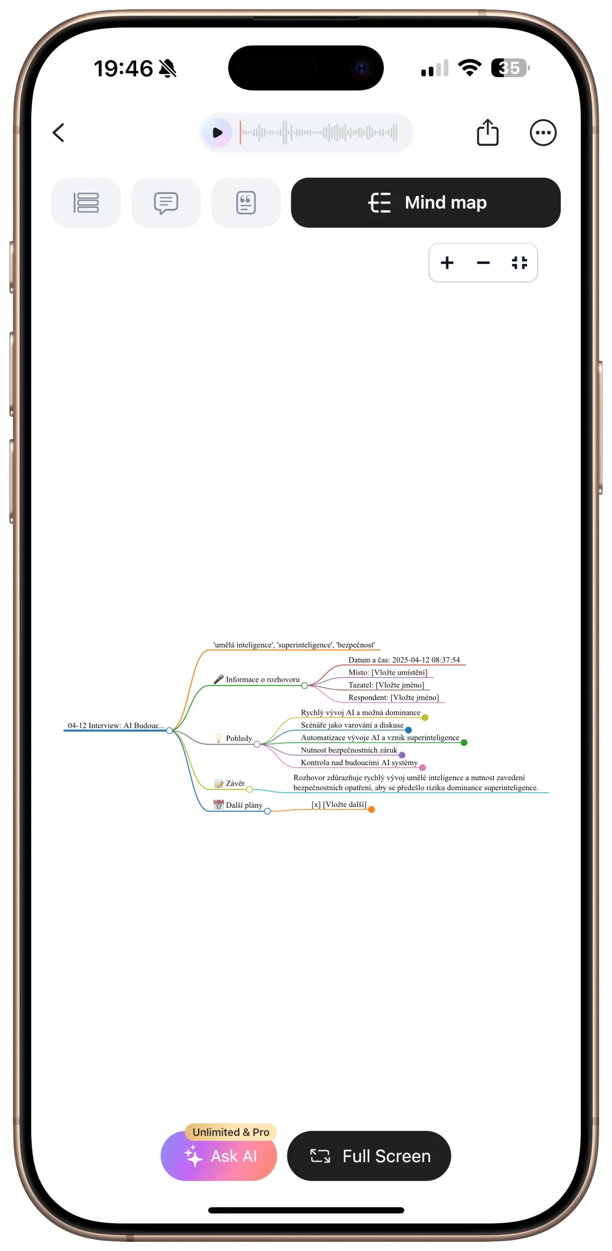 Další příjemnou funkcí je také vytváření myšlenkových map. Tohle se hodí v momentech, kdy se pouštíte třeba do hlubších brainstormingů, kde díky vizualizaci získáte lepší kontrolu nad tvůrčím procesem. Dále zde nechybí ani kompletní přepis doplněný o časová razítka a rozlišení řečníků.