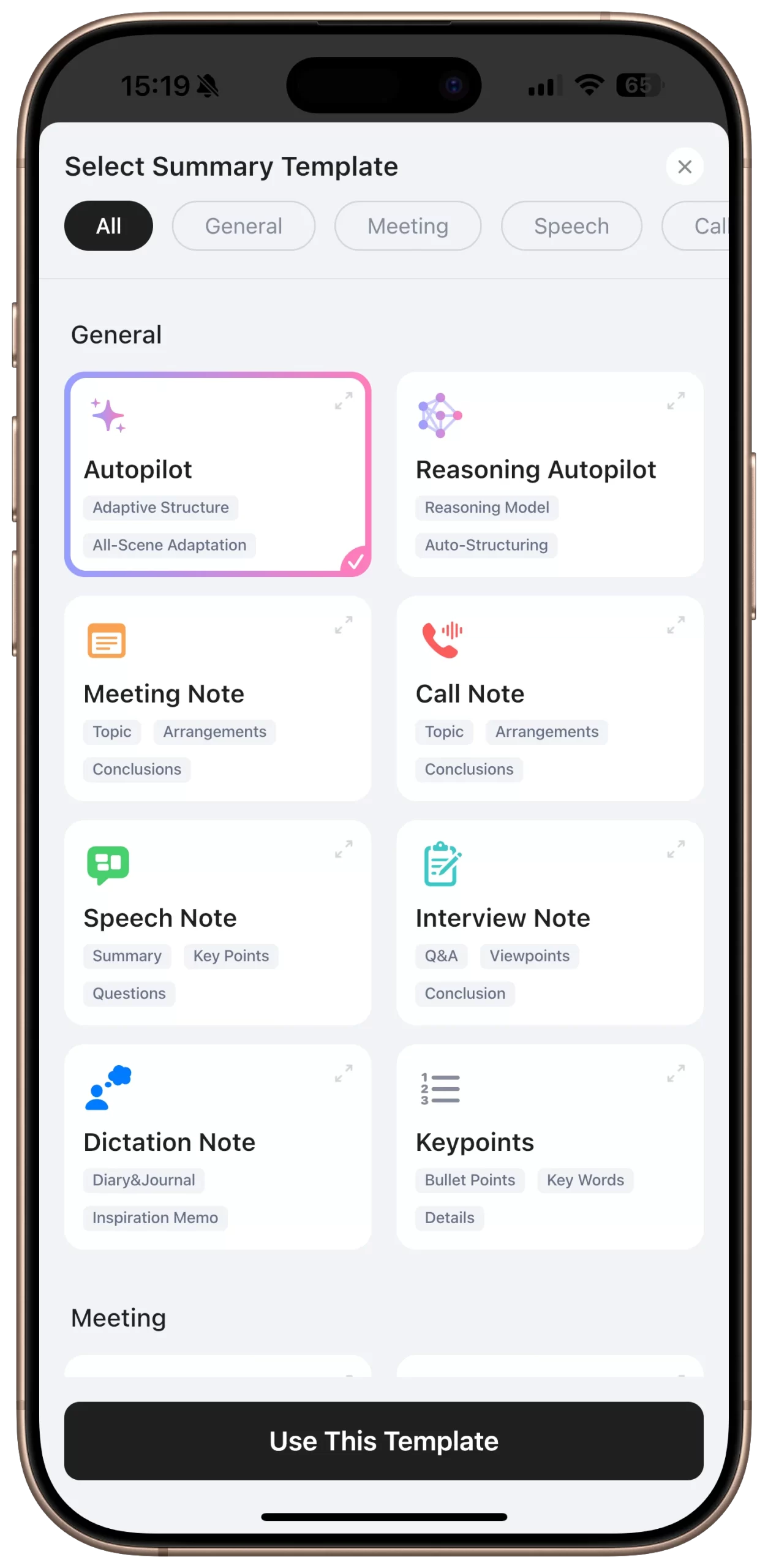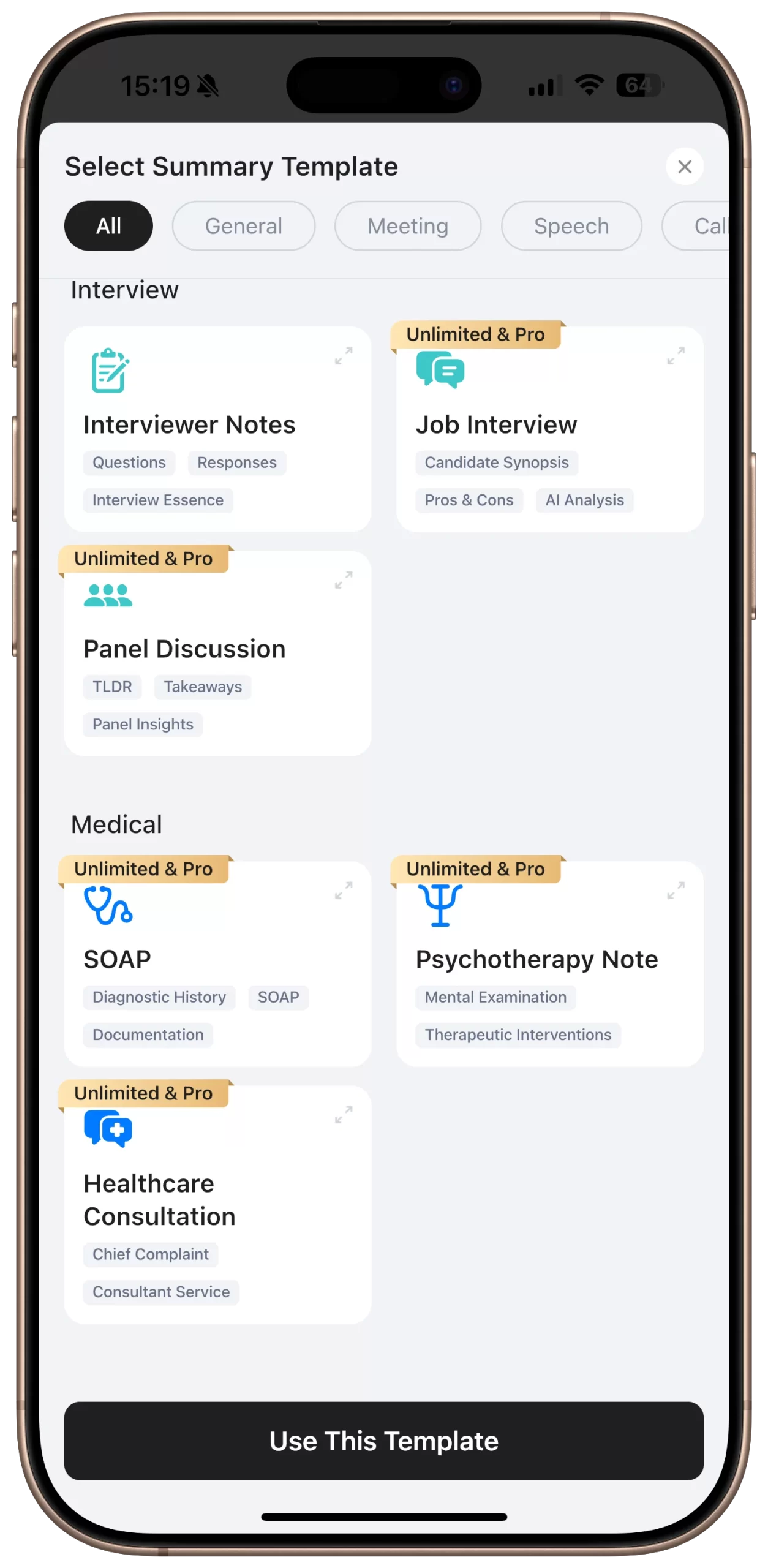 V nabídce naleznete šablony pro tradiční události jako jsou například obchodní schůzky, rozhovory či konzultace. Kromě toho zde ale máte i šablony pro náborové pohovory, lékařské konzultace včetně psychoterapií či panelové diskuze. Plaud totiž umí rozlišit také jednotlivé řečníky, takže se skvěle hodí na skupinová jednání, pracovní porady a další.