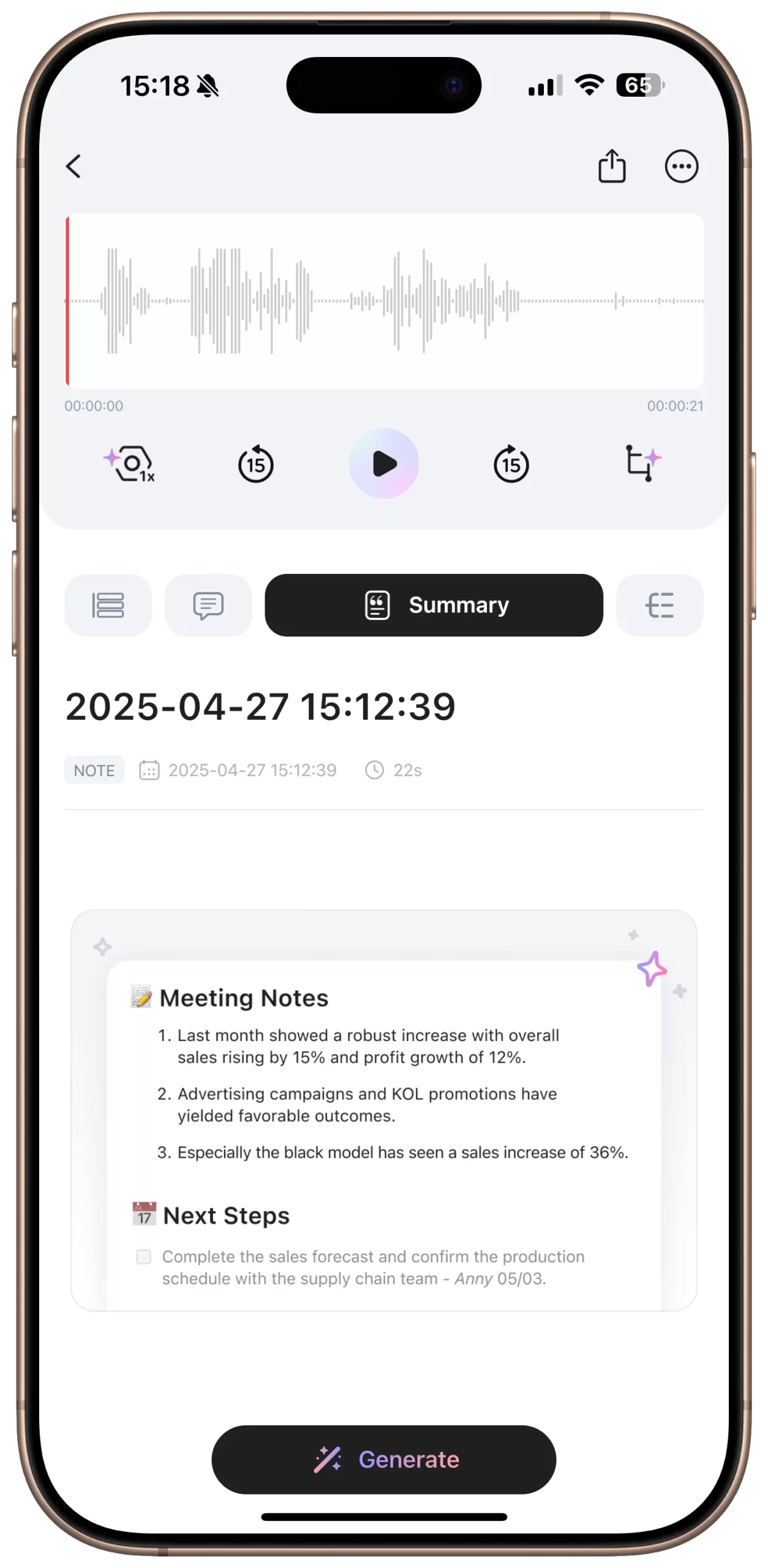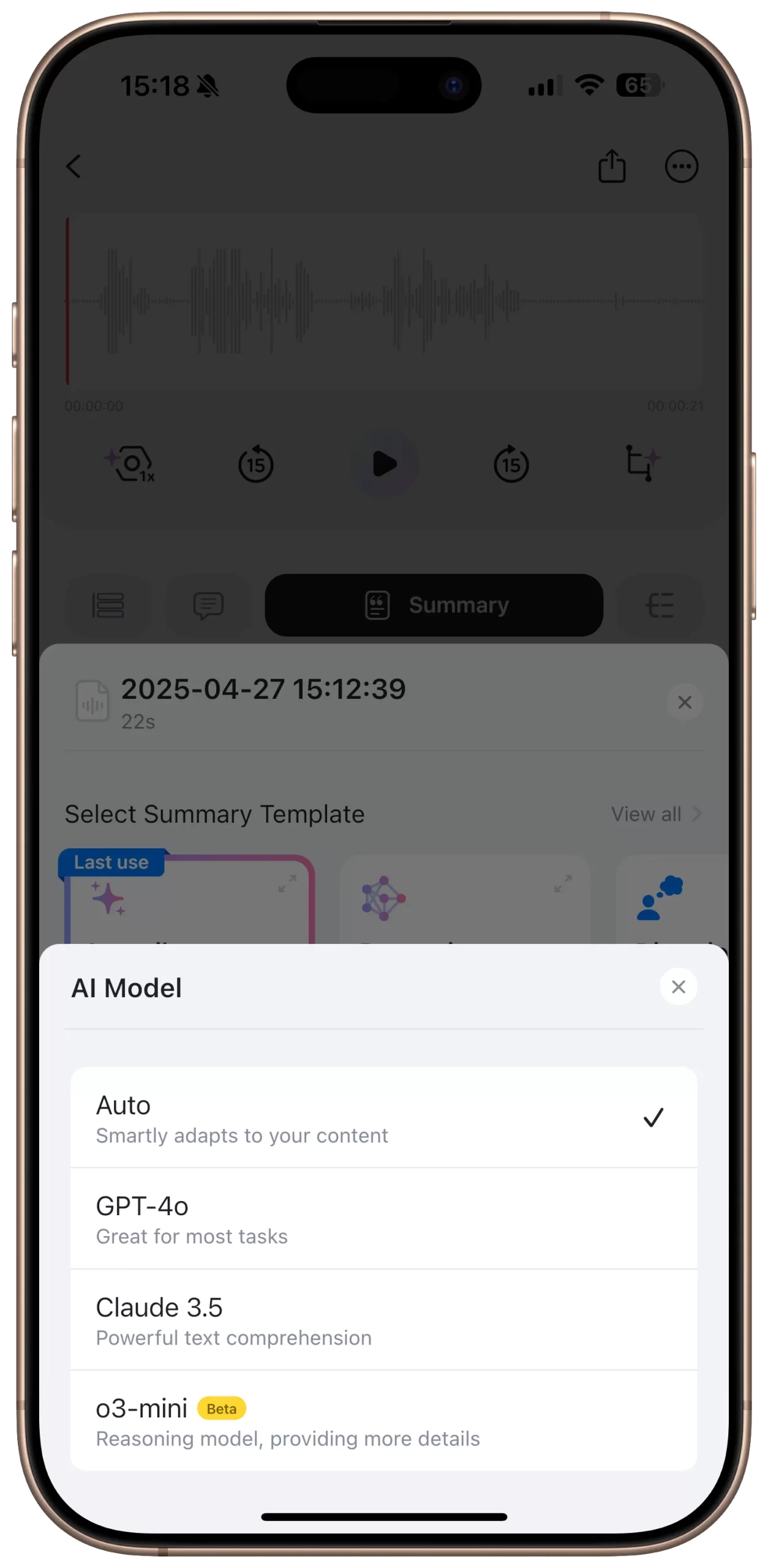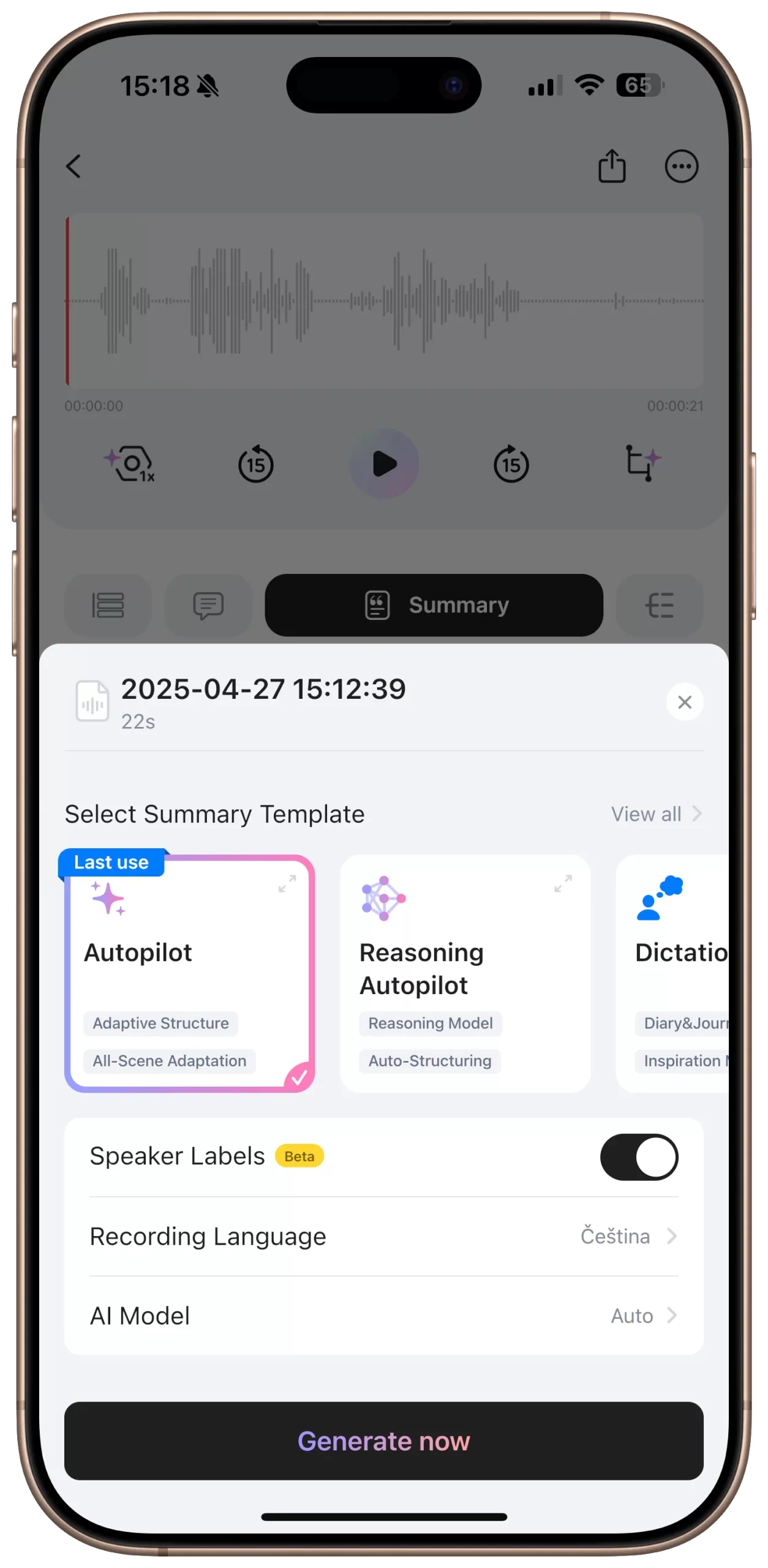 A jak že to funguje celé v praxi? Jakmile se vám nahrávka přenese do mobilní aplikace, stačí ji otevřít, kliknout na tlačítko “Generate“ a vybrat si z několika nabídek. V prvé řadě je třeba určit, v jakém jazyce byla nahrávka pořízena a který jazykový model chcete použít pro zpracování. V době testování bylo možné vybírat z AI modelů GPT-4o, o3-mini a Claude 3.5 od Anthropic. Hlavní zbraní Plaudu jsou ovšem sumarizační šablony. Celkem jich máte k dispozici několik desítek a zahrnují nejrůznější scénáře.