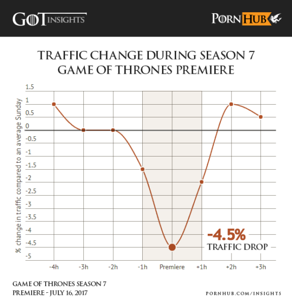Každý premiérový díl Hry o Trůny se dokonce podepisuje i na provozu porno webu Pornhub. Ten v rámci svých podrobně zpracovaných statistik, které web pravidelně zveřejňuje, ukazuje, že během premiéry prvního dílu spadl počet návštěvníků Pornhubu o 4,5 procent. Po skončení dílu naopak provoz opět vzrostl.