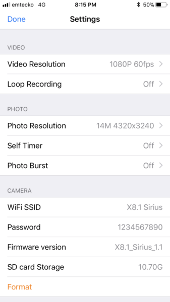 V oficiálních materiálech výrobce se lze dočíst, že při časosběrném režimu je kamera schopna natáčet až v rozlišení 4k. V tomto případě se ovšem jedná o takzvanou interpolaci, kdy je záběr do vyššího rozlišení upraven uměle softwarem. Vedle toho najde uživatel v nastavení ještě další možnosti jako například režim pro natáčení pod vodou, možnost přizpůsobení efektu rybího oka nebo vyladění barev. Užitečnou funkcí je také přítomnost WiFi, díky které je možné propojit kameru s mobilním telefonem. Na tom pak lze zařízení nejen ovládat a nastavovat, ale také do něj stáhnout pořízený materiál.