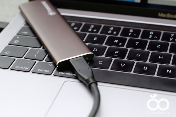 Jediným možným řešením je tedy pořízení externího disku. Velmi zajímavé variantu nabízí společnost Transcend, která na náš trh uvedla externí disk StoreJet 600, čímž přímo cílí na uživatele Maců. Samotný disk je uložen do elegantního pouzdra z hliníku s tloušťkou pouhých 7,5 milimetru. Ke zpracování lze dodat pouze, že je na té nejvyšší možné úrovni. Příjemným detailem jsou broušené hrany a decentní logo výrobce. Propojení s MacBookem obstarává rozhraní USB-C (USB 3.1, Gen 2). Uvnitř se pak nachází klasické SATA SSD (M.2) s kapacitou 240 GB.