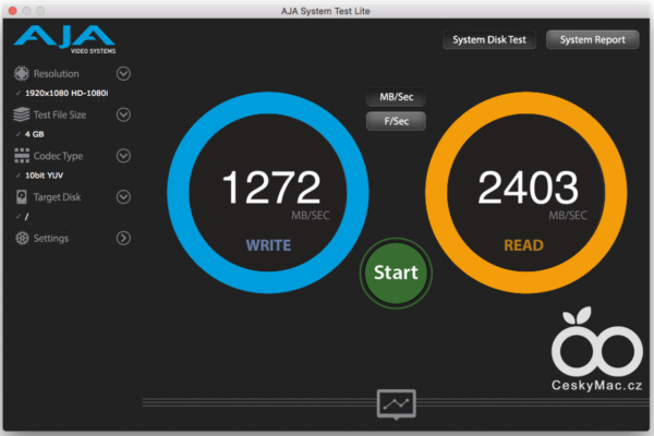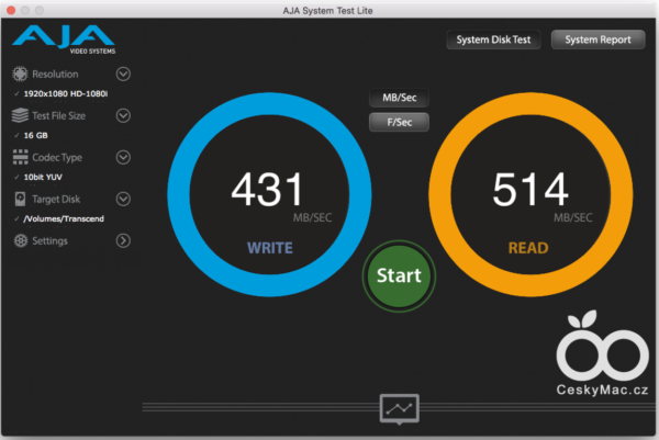 Nás pochopitelně nejvíce zajímalo, jak si externí disk povede z hlediska rychlosti. K měření jsme použili software AJA System Test s několika velikostmi testovacích souborů. V obou případech jsme naměřili 431 MB/s pro čtení a 514 MB/s pro zápis. Na výrobcem udávaných 470 MB/s jsme sice nedosáhli, nicméně výslednou odchylku lze považovat za zcela přijatelnou. Příjemně nás také překvapilo, že disk se v zátěží zahřívá pouze minimálně.