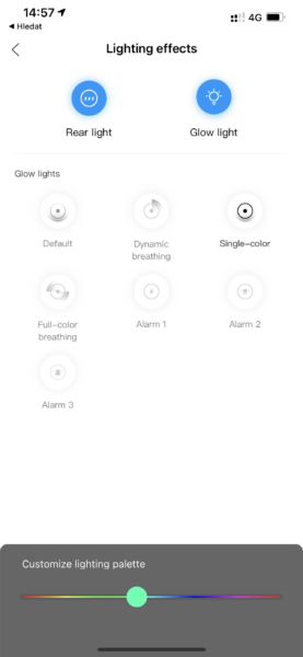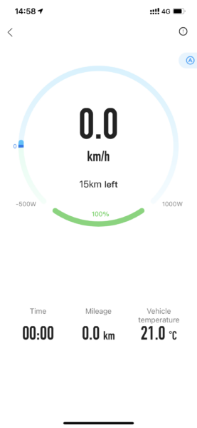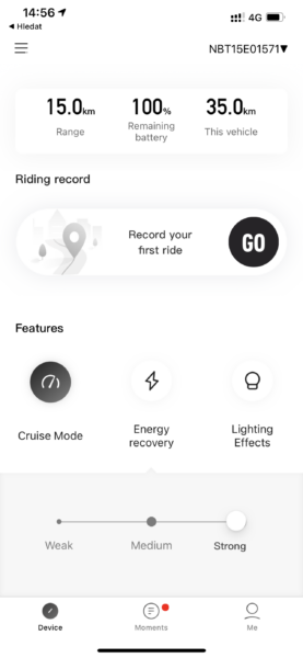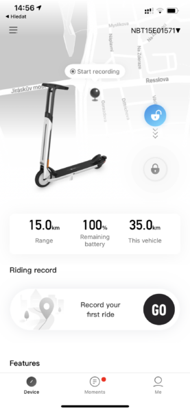V chytré aplikaci, kterou musím v první řadě pochválit za čistý, přehledný a moderní design, vidíme dojezd, zbývající baterii v procentech a vzdálenost, kterou už váš stroj ujel. Vzhledem k tomu, že má aplikace přístup k GPS souřadnicím, můžete si vaše jízdy zaznamenávat podobně jako je tomu například u aplikací od Nike na běh. Dále si zde můžeme nastavit rekuperaci a ambientní osvětlení, které má opravdu širokou škálu možností. V případě jakéhokoli ohrožení, nebo odcizení vaší koloběžky ji zde můžete uzamknout. Tato funkce znemožní zapnutí elektromotoru.