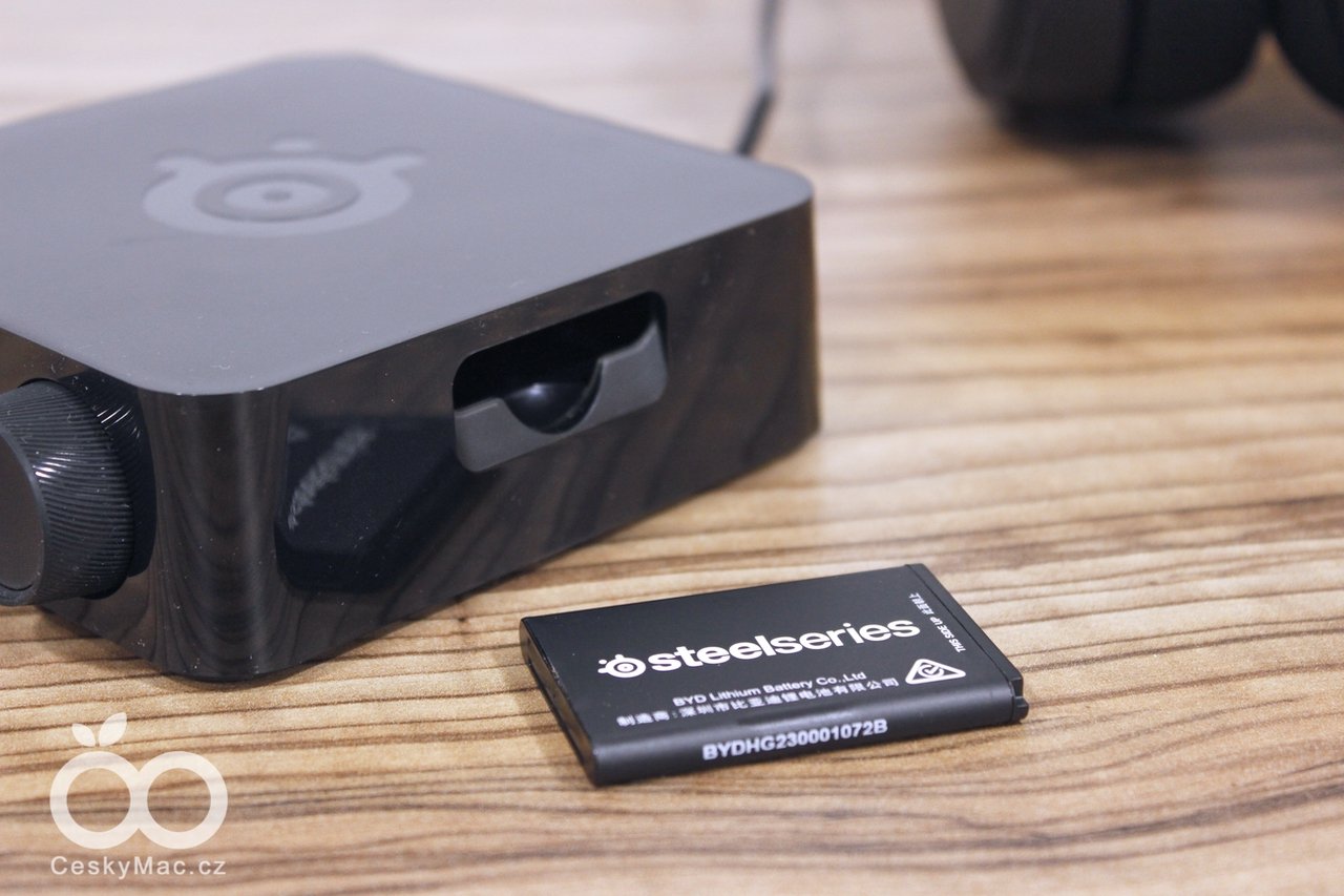 Bočnice pravé mušle má navíc magnetický kryt, pod nímž se nachází vyměnitelných akumulátor. Další je pak součástí prodejního balení. Výdrž se pohybuje kolem deseti hodin na jedno nabití. Celkem tedy můžete počítat s dvaceti hodinami poslechu. Prakticky je však výdrž neomezená, jelikož jeden z akumulátorů se vždy nabíjí ve vysílači, který slouží jako dobíjecí stanice. Tento způsob řešení vážně nemá chybu a jde o jednu z věcí, kterou jsem si na SteelSeries Arctis Pro Wirelles okamžitě zamiloval. Za tohle vážně palec nahoru.