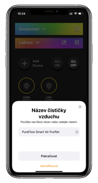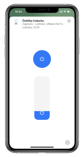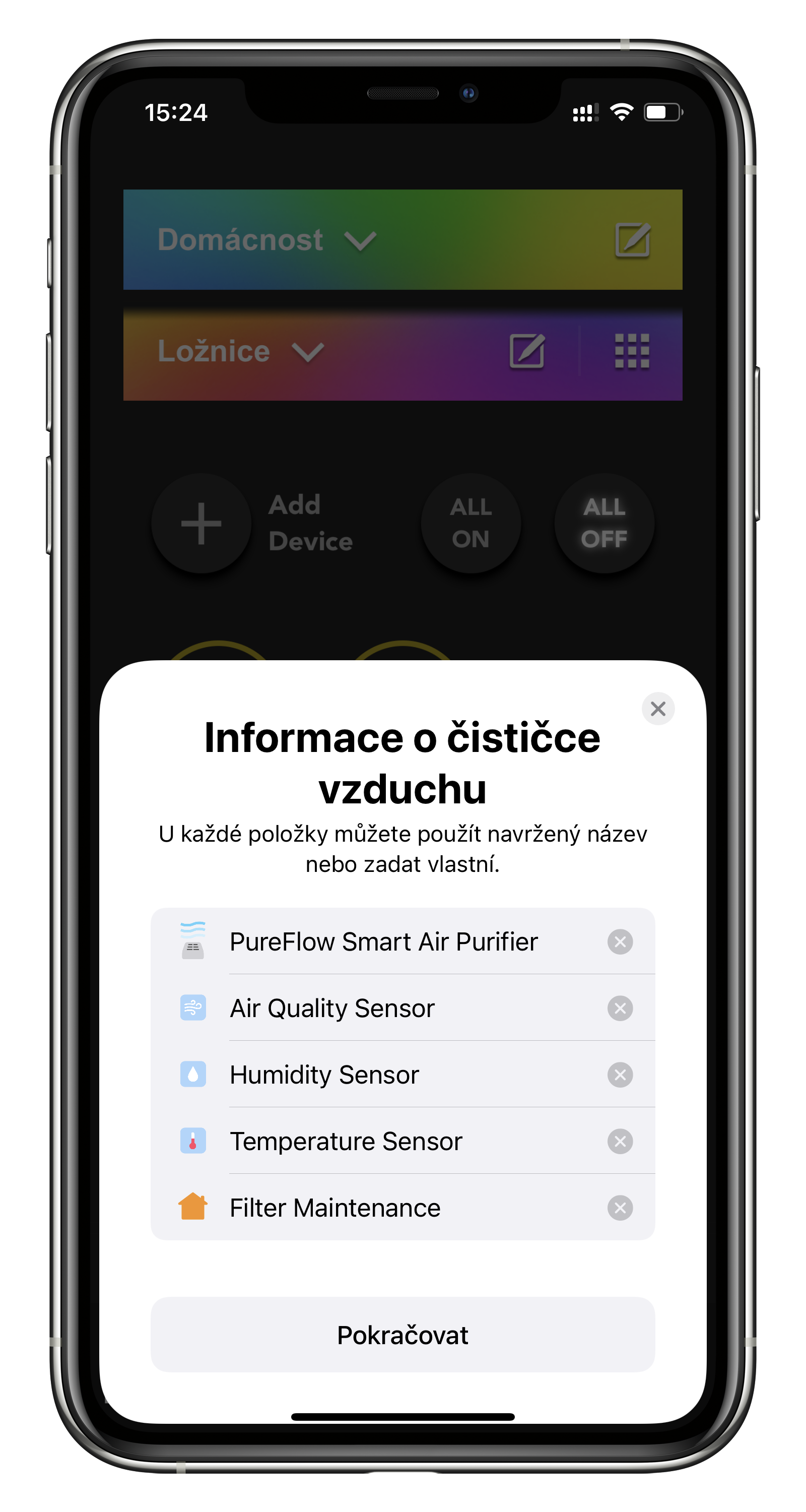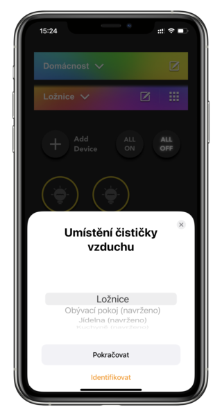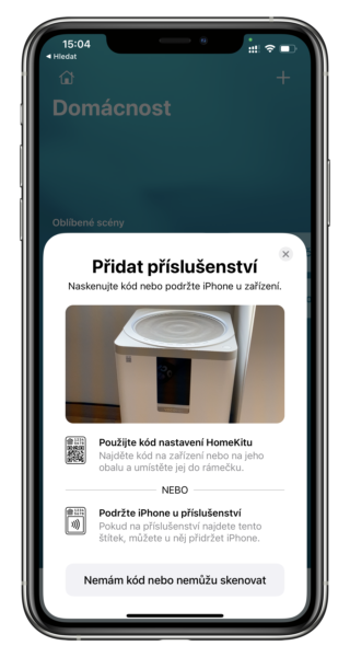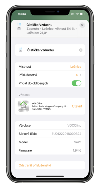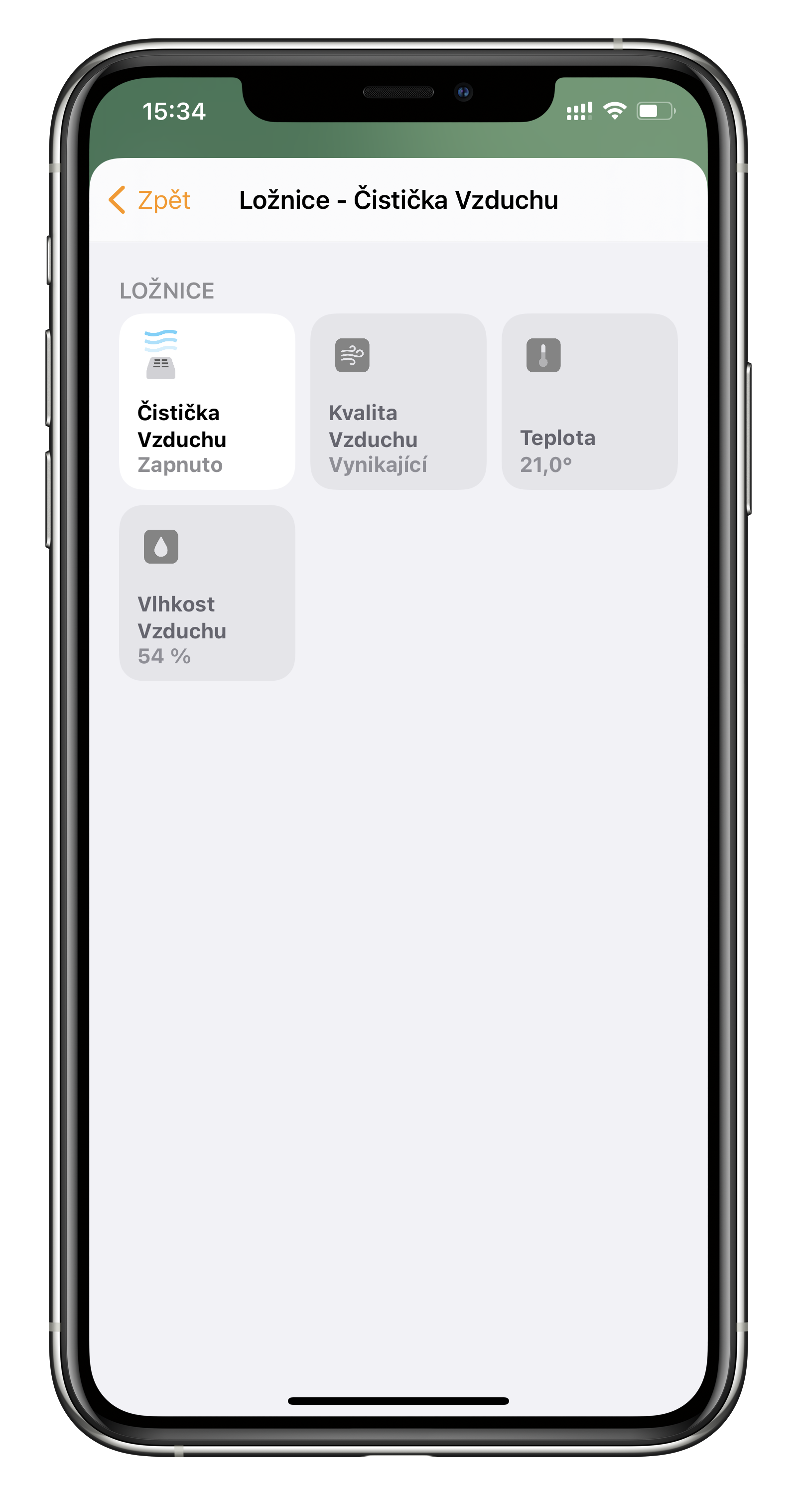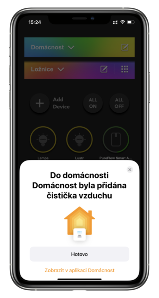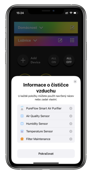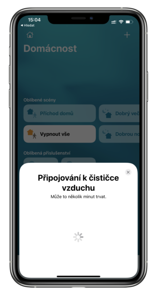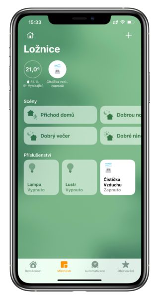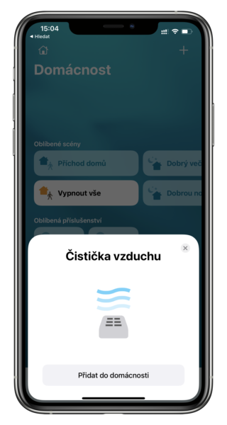 Čističku vzduchu pak ovšem můžete ovládat i přímo z aplikace Domácnost, kde se vám zobrazí pod čtyřmi ikonami. Uvidíte zde senzor kvality vzduchu, senzor vlhkosti, senzor teploty a samotnou čističku. V aplikaci Domácnost můžete také tvořit Scény, Automatizace a můžete daný produkt přiřadit do určité místnosti. Vše pak lze ovládat i hlasem pomocí hlasové asistentky Siri. Pokud chcete příslušenství ovládat i vzdáleně budete potřebovat tzv. Domácí centrum, které může tvořit Apple TV, HomePod nebo iPad, který zůstává doma a je připojený k Wi-Fi.
