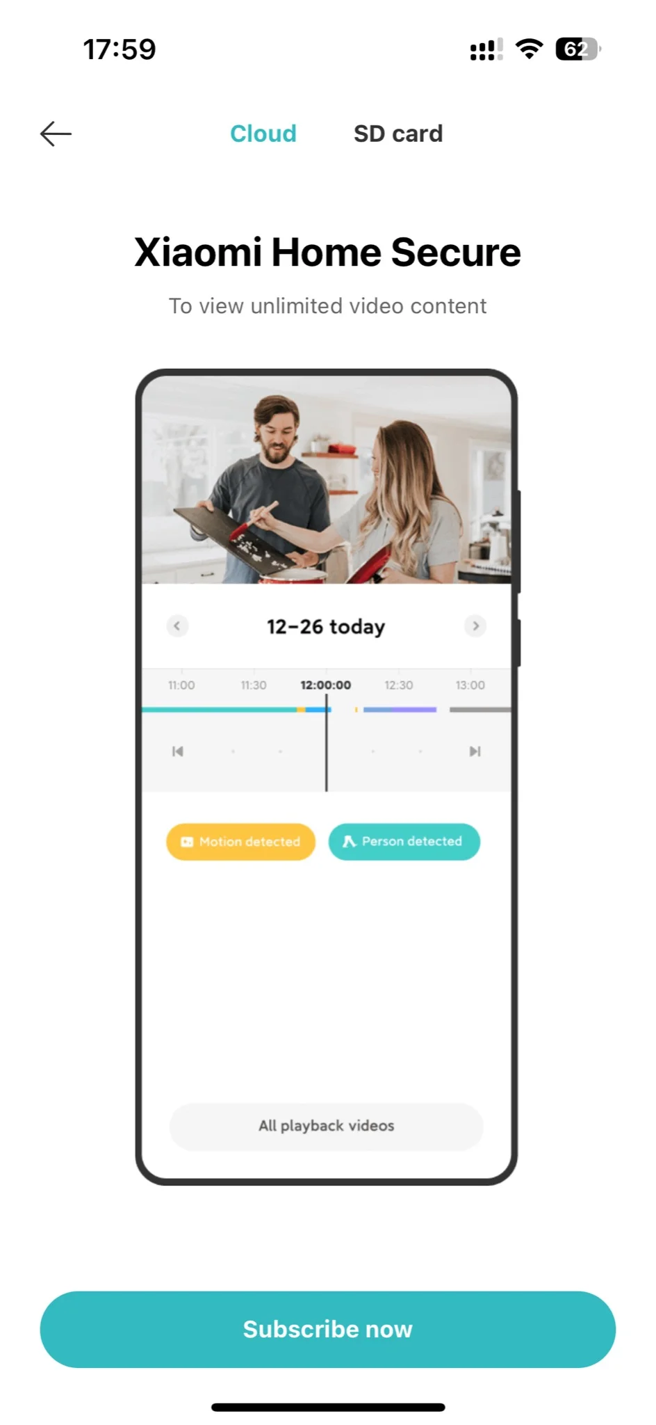 Pro ty, kteří preferují cloudová řešení, nabízí Xiaomi placenou službu Xiaomi Home Secure. Tato služba umožňuje ukládání záznamů na serverech Xiaomi a jejich přístup odkudkoli. Cena za tuto službu začíná na 99 korunách měsíčně za 1 kameru.