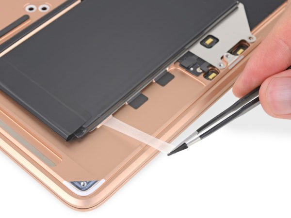 Pozitivní naladění neskončilo ani u akumulátoru s kapacitou 49,9 Wh. Baterie drží na svém místě za pomoci několika pásků s lepidlem, které není takový problém odstranit. V případě čtečky otisků Touch ID se ukázalo, že opět jde o modulární součástku. Pokud tedy dojde k jejímu poškození, oprava nebude muset zahrnovat kompletní výměnu základní desky.