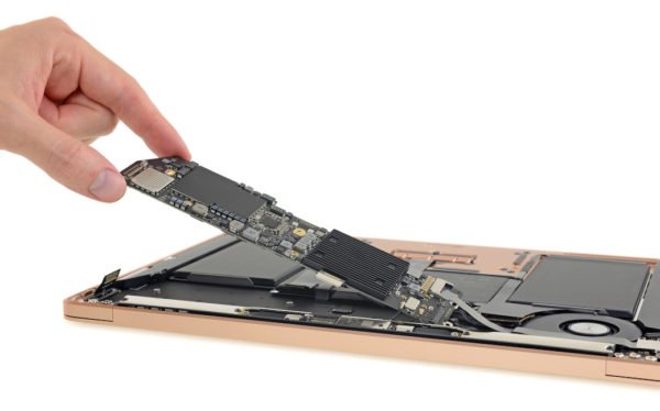 Na spodní straně základní desky (Logic Board) se pak nachází bezpečností čip Apple T2, kterému dělá společnost řadič Thunderbolt 3 od Intelu. Nechybí zde ani napevno připájené SSD (v tomto případě 128 GB) od Sandisku a 8GB RAM od společnosti SK Hynix.