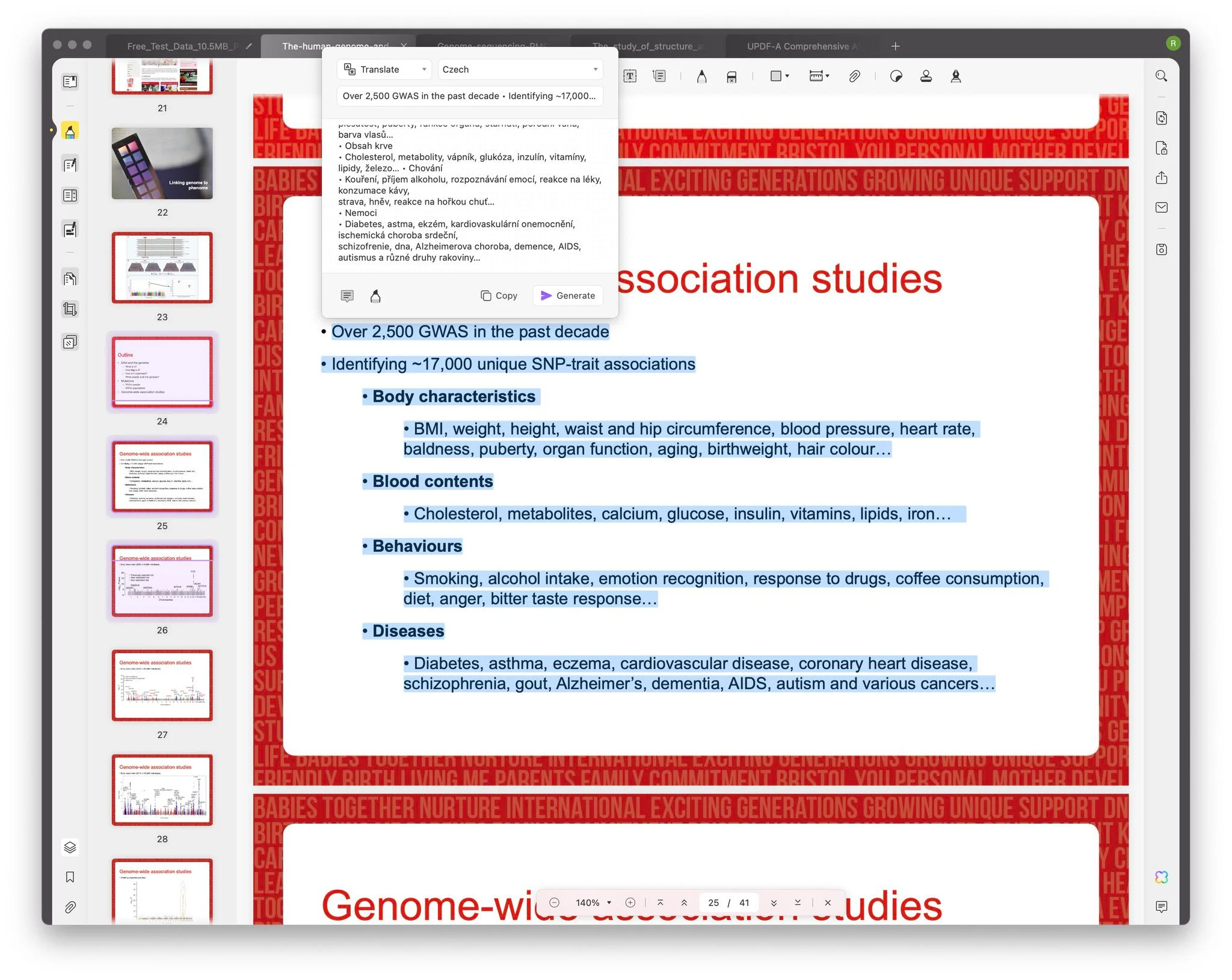 Co už tak běžné rozhodně není a souvisí to se současnými trendy, je integrace umělé inteligence. Asistenci AI můžete využít například tak, že označíte konkrétní část textu. Ten si následně můžete nechat přeložit jiného jazyka (včetně češtiny), vytvořit z něj bodový souhrn, nebo si jej nechat vysvětlit. S umělou inteligencí souvisí také ikona v pravém dolním rohu. Jakmile na ní kliknete, otevře se panel s chatbotem, který funguje na podobném principu jako to známe z ChatGPT. Při práci s dokumentem si tak můžete nechat vytvořit jeho kompletní analýzu, shrnutí či překlad do jiného jazyka. Používání AI v rámci UPDF je naprosto instantní a osobně ji považuji za klíčový benefit celé aplikace.