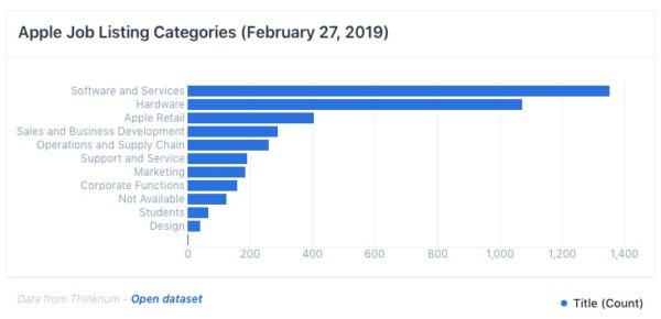 Po softwarových a hardwarových vývojářích Apple nejvíce poptává prodejce, pracovníky podpory, logistické pracovníky nebo markeťáky. Nejméně otevřených pozic je poté na pracovní místa spojené s designem.
