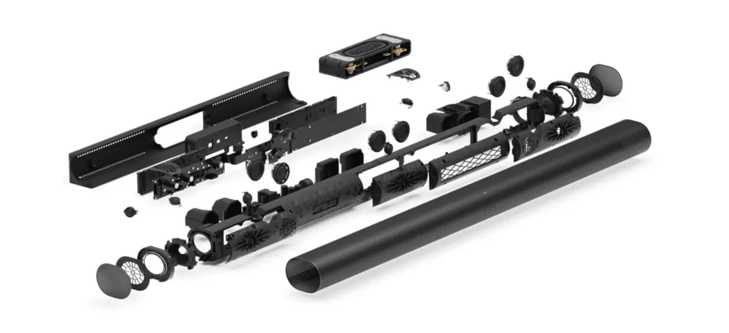 Zatímco navenek působí Arc Ultra podobně jako jeho starší předchůdce, vnitřní architektura je zbrusu nová a skýtá nejedno delikátní řešení. V prvé řadě je třeba zdůraznit, že jde o systém 9.1.4, což samo o sobě představuje zajímavé unikum. Uvnitř soundbaru se totiž ukrývá devět předních a čtyři horní kanály, které doplňuje subwoofer. Ano čtete správně, uvnitř soundbaru se nachází samostatný subwoofer s technologií Sound Motion.