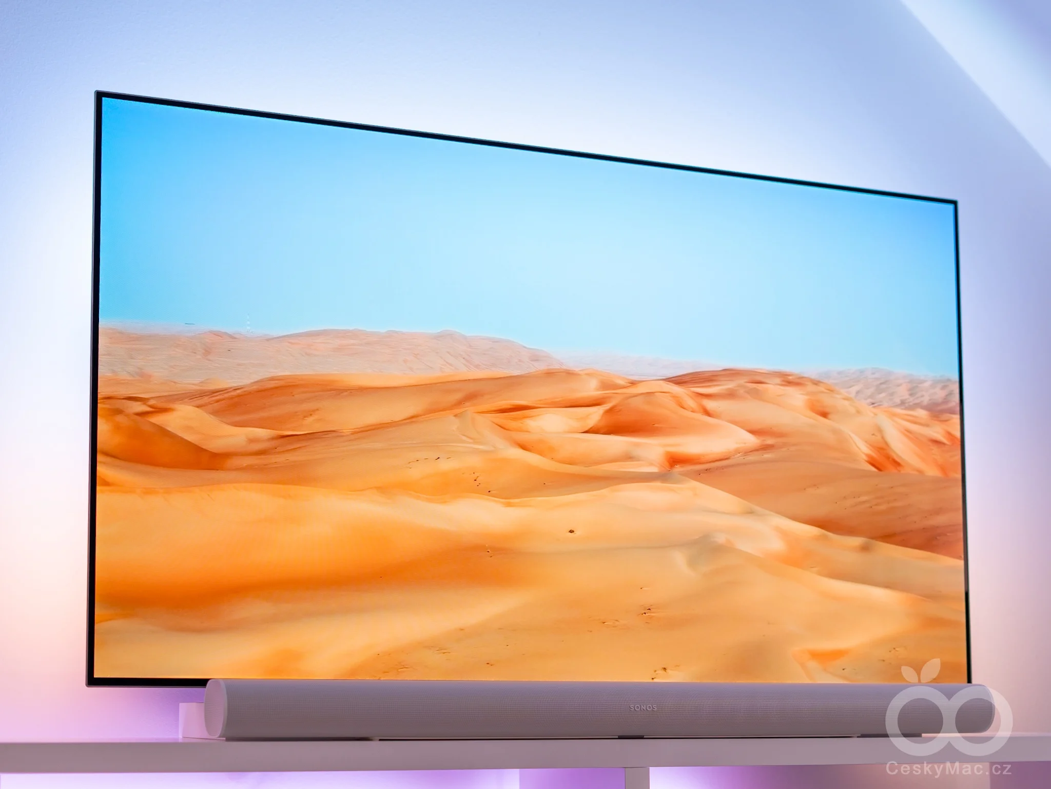 Sonos Arc Ultra je pořádný kus soundbaru (117,8 x 110,6 x 75 mm), který skvěle doplní televizory s větší úhlopříčkou (na fotografii je 65″ obrazovka)