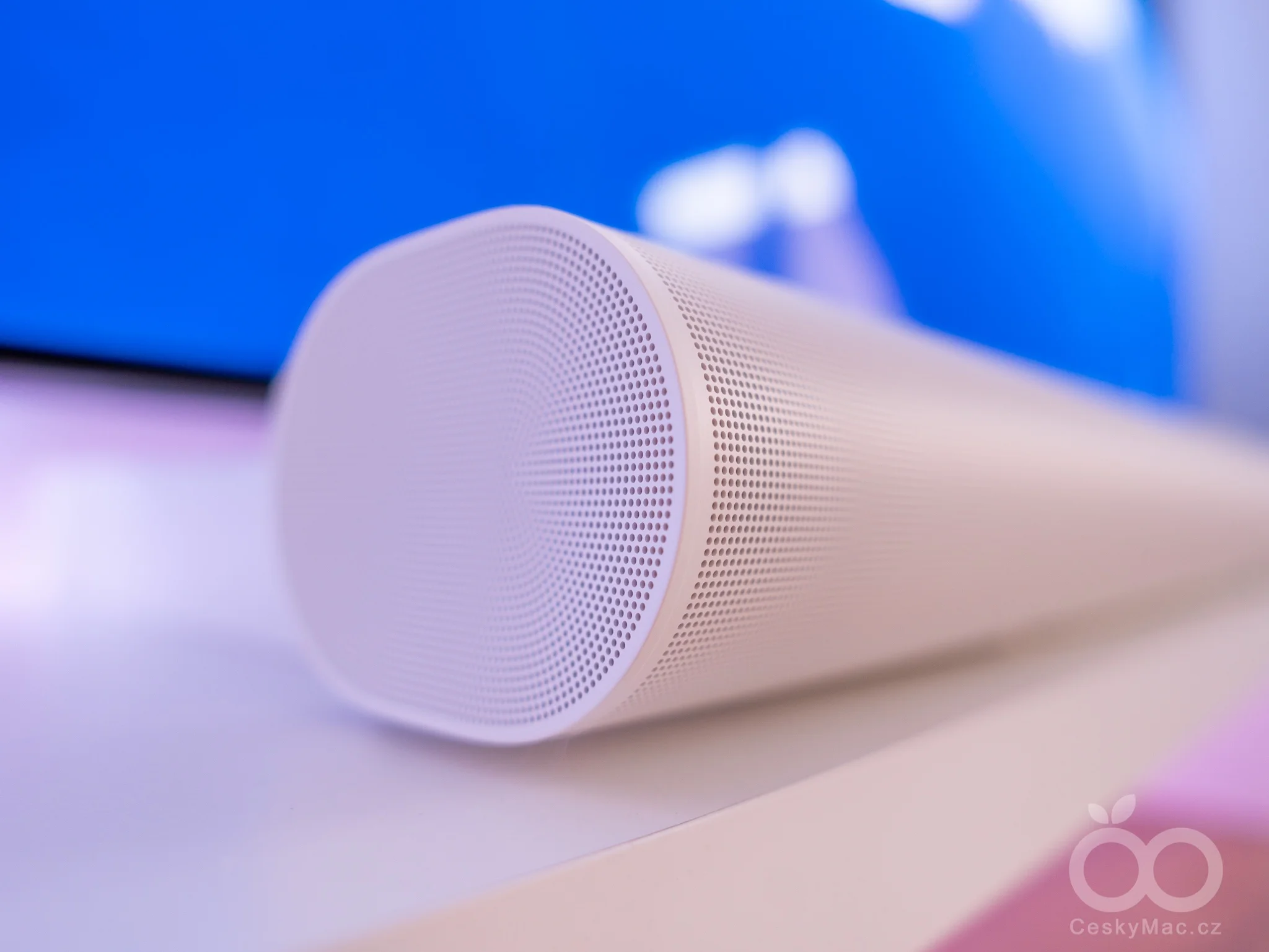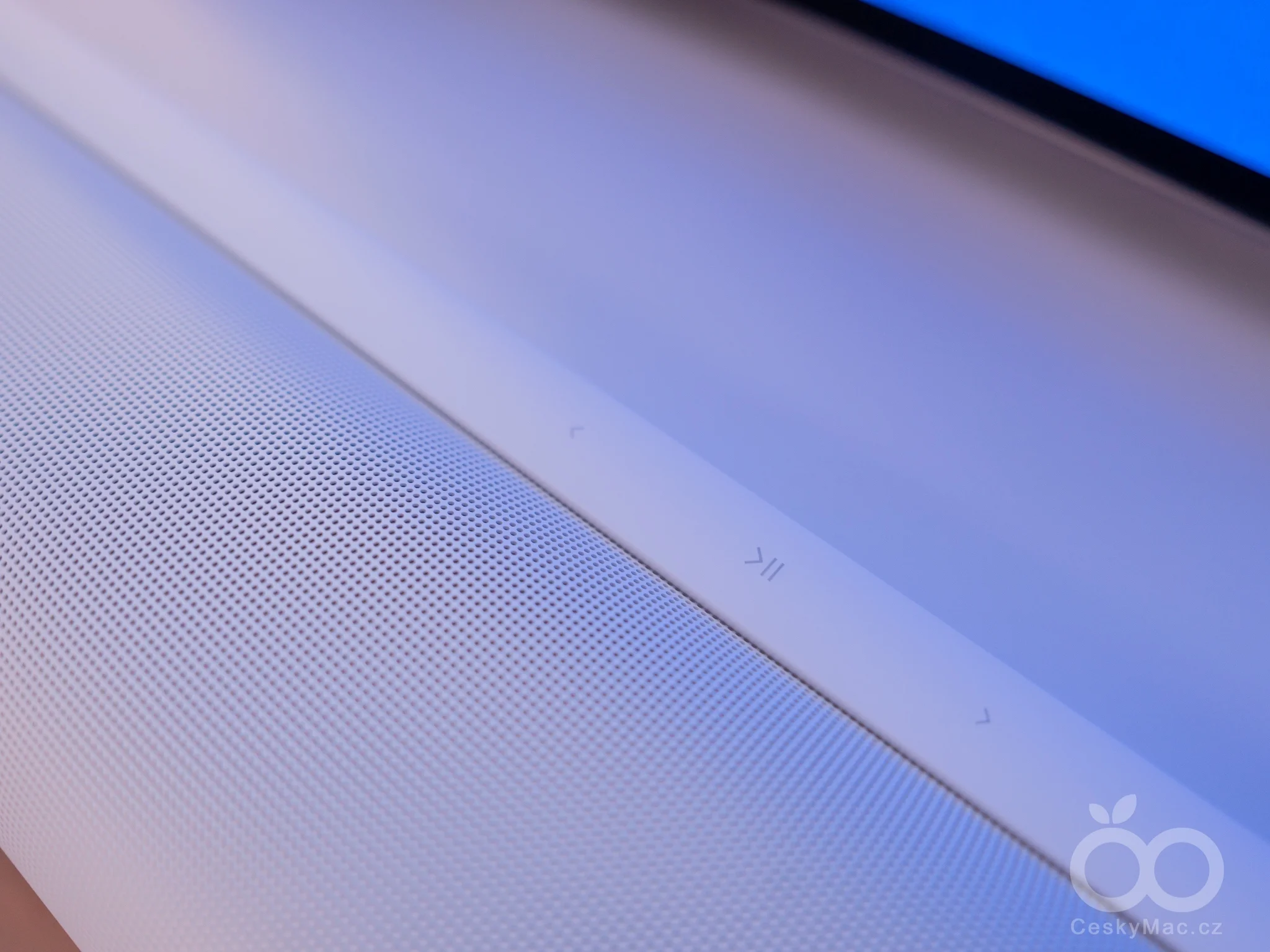 Většinu plochy soundbaru tvoří perforovaný plášť, který na přední straně narušuje pouze decentní logo výrobce. Další důležitou částí je ovládací panel umístěný na horní části. Ten zahrnuje sérii dotykový tlačítek, přičemž všechny ovládací prvky jsou řešené stejně jako to známe z aktuálních modelů Era 300, Era 100 či Sonos Move 2 (recenze).