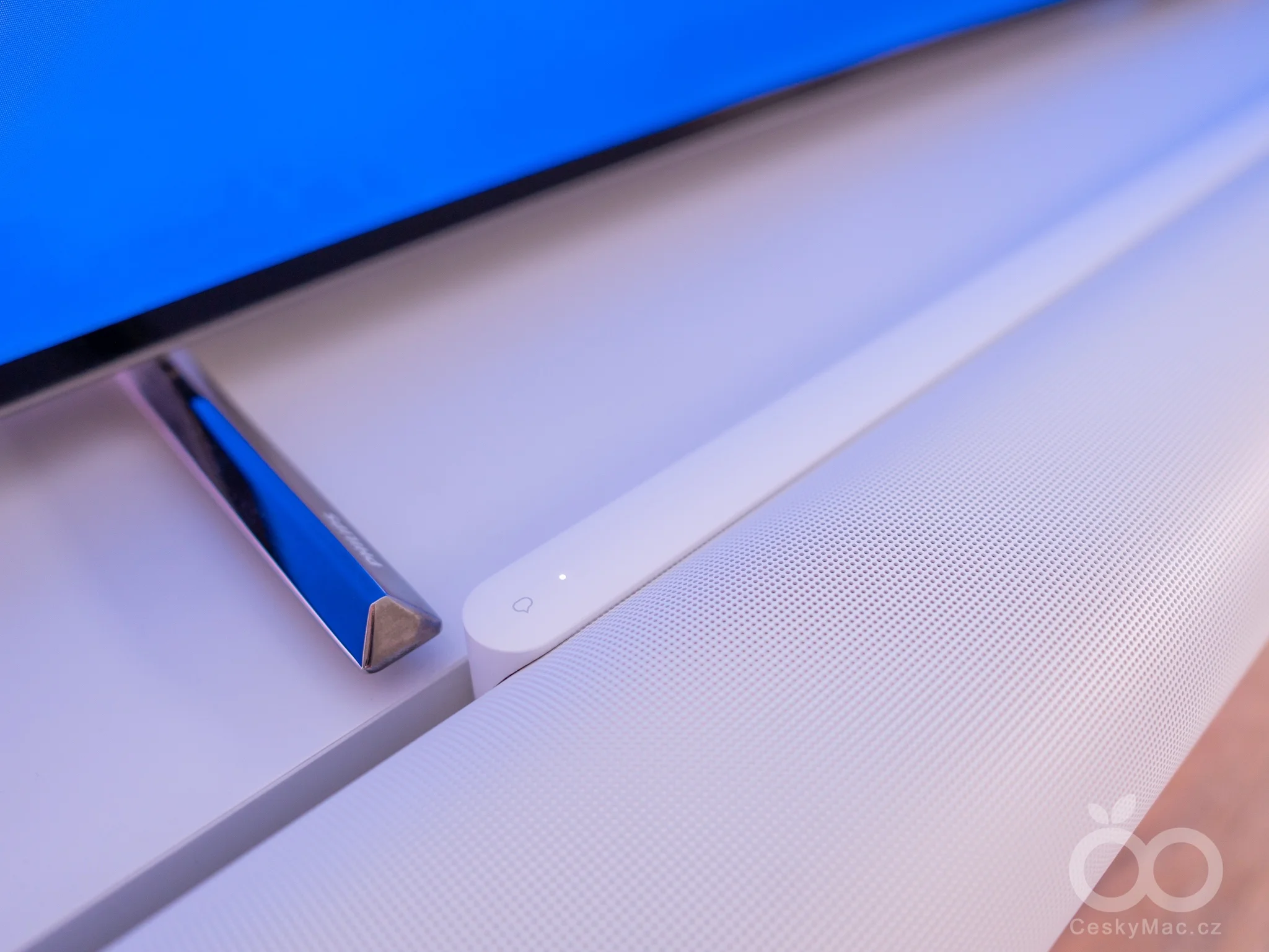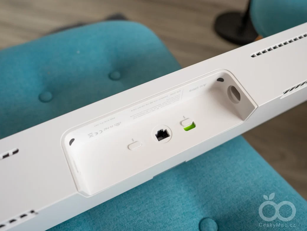 Soundbar se připojuje k televizoru prostřednictvím HDMI (eARC) rozhraní, které najdete na zadní straně. V jeho těsné blízkosti se dále nachází ještě port RJ45 a fyzický vypínač mikrofonů, který je natvrdo odpojí od napájení. Na tomto poněkud skrytém místě najdeme také tlačítko Bluetooth pro spuštění párovacího režimu. Osobně si však troufám tvrdit, že zejména pokud patříte mezi majitele Apple ekosystému, tak přítomnost Bluetooth zřejmě tolik neoceníte díky mnohem pohodlnějšímu řešení v podobě AirPlay 2 či přístupu z mobilní aplikace.
